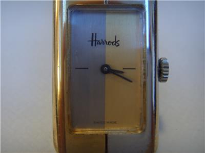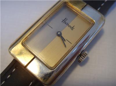 DESCRIPTION : LADIES ORIGINAL HARRODS 1980s SWISS MADE RETRO WATCH IN A RECTANGULAR SHAPE, BEZEL HAS HALF GOLD TONE AND HALF SILVER TONE DESIGN DIVIDED DOWN THE CENTRE. THE DIAL HAS THE OPPOSITE DESIGN, BLACK HOUR AND MINUTE HANDS AND MARKERS AT 3 & 9. DIAL MARKED HARRODS & SWISS MADE TO BOTTOM, REAR STAINLESS STEEL CASE BACK STAMPED 68 456. NEW EXTRA LONG BLACK LEATHER STRAP WITH WHITE STICHING & GOLD TONE BUCKLE. WATCH HAS A QUALITY SWISS 17 JEWEL MECHANICAL WIND UP MOVEMENT AS YOU WOUL EXPECT IF BOUGHT IN HARRODS.