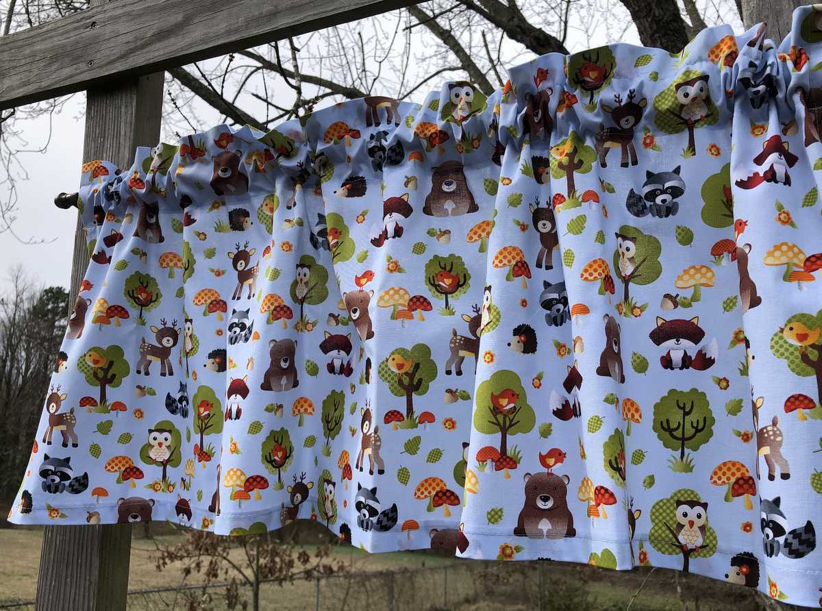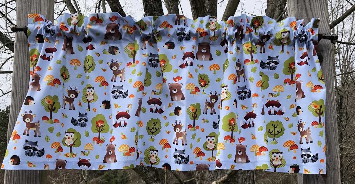 Forest Animal Valance Woodland Wildlife Fox Bear Owl Raccoon Blue Nursery Curtain Valance