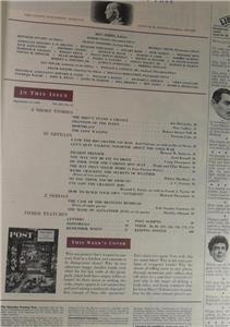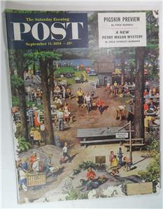 THE SATURDAY EVENING POST MAGAZINE FROM SEPTEMBER 11, 1954, PUBLISHED BY THE CURTIS PUBLISHING COMPANY WITH GREAT COUNTY PICNIC GROUNDS COVER. BEGINNING OF PERRY MASON SERIAL "THE CASE OF THE RESTLESS REDHEAD" BY ERLE STANLY GARDNER. OTHER FICTION BY MARTHA ALBRAND AND OTHERS. ARTICLES: ON RIO GRANDE RIVER FLOODING, 1954 COLLEGE FOOTBALL PRESEASON OUTLOOK PICTURING 10 PLAYERS, EARLY ARTICLE ON METEROLOGY, SO YOU THING YOU'RE IMMUNE ABOUT IMMUNIZATION, ON THE COLD WAR, WOMEN'S HATS AND OTHERS. GREAT FULL PAGE COLOR AND B/W INTERIOR ADS. MAGAZINE IS IN ABOUT GOOD CONDITION WITH FLAKING OFF EDES, COVERS RUBBED WITH CREASES, EDGE AND SPINE WEAR. POSTAGE $6.00 IN THE UNITED STATES AND BY ARRANGEMENT OVERSEAS. I COMBINE ORDERS TO SAVE ON POSTAGE. PAYMENT CAN BE MADE BY PAYPAL........ GOOD LUCK!