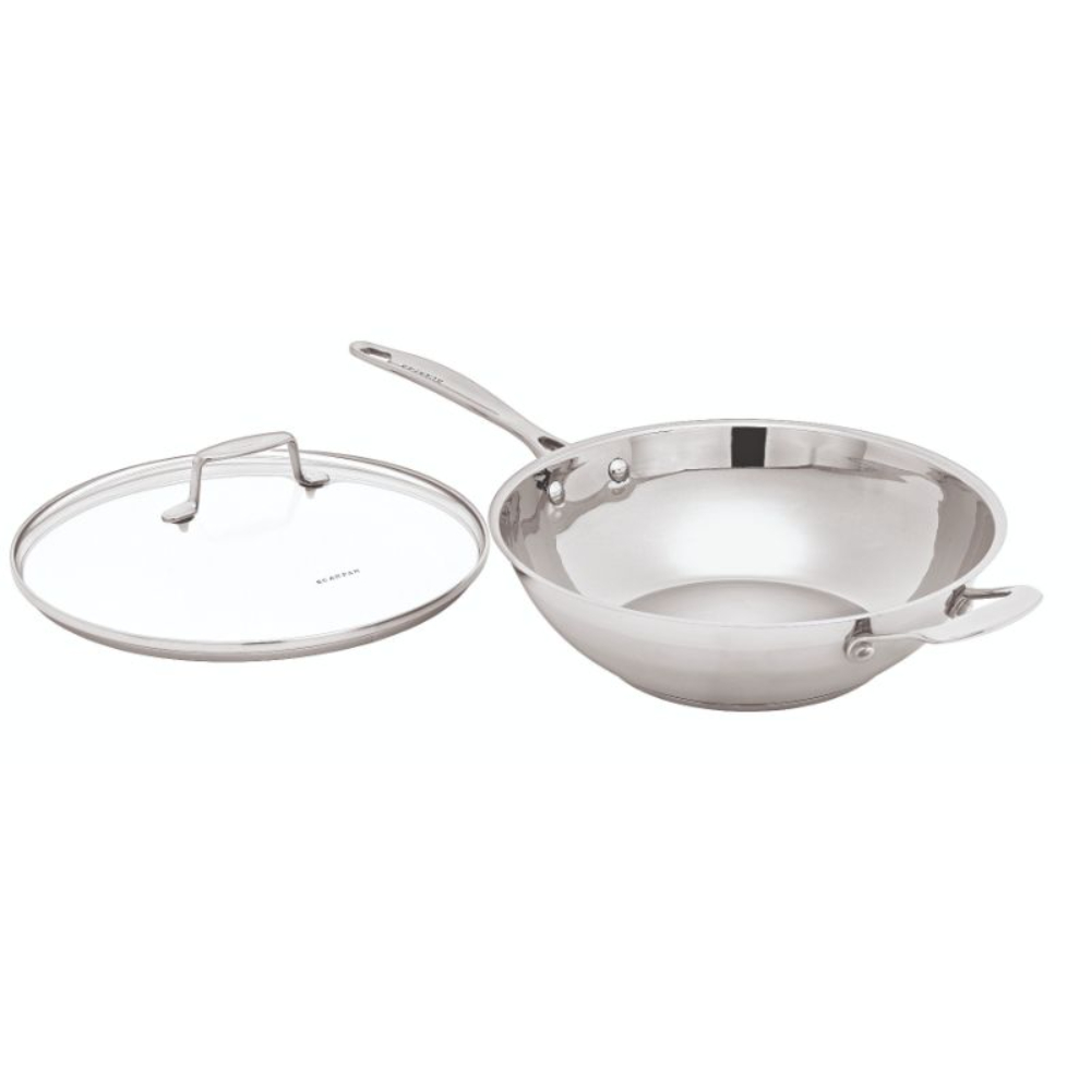 This 32cm Covered Wok is an elegant piece ideal for Asian cooking with its stylish two tone matt/polished appearance with a glass lid to enable easy viewing of your cooking in progress.After cooking, do not put cold water in a hot pan; wait until cool, remove all food and fat residue using hot soapy water and nylon cloth/brush; Heat tint or streak marks can be caused by excessive high heat. Do NOT use excessive high heat.To remove streak marks, mix 2 tablespoons of bi-carb soda with water to create a paste.