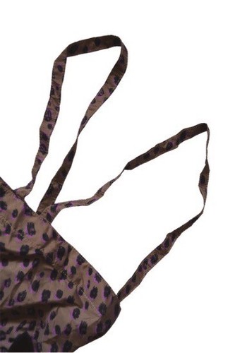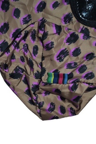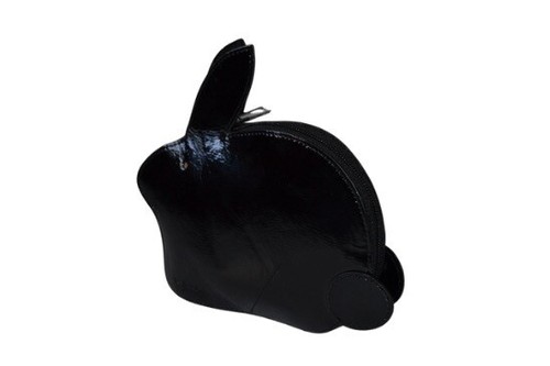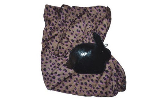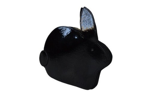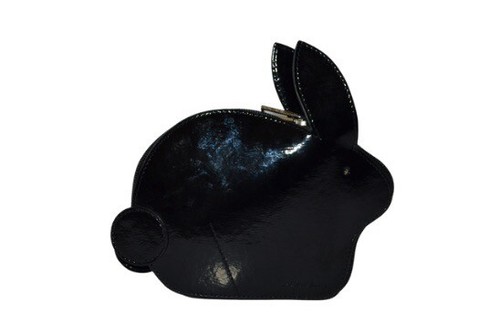 Fabriqué à partir de cuir lisse noir brillant en forme de lapin, ce fourre-tout pliable est doté d'une fermeture éclair sur tout le pourtour, qui s'ouvre pour révéler un sac fourre-tout doré avec des motifs noirs et roses. taches