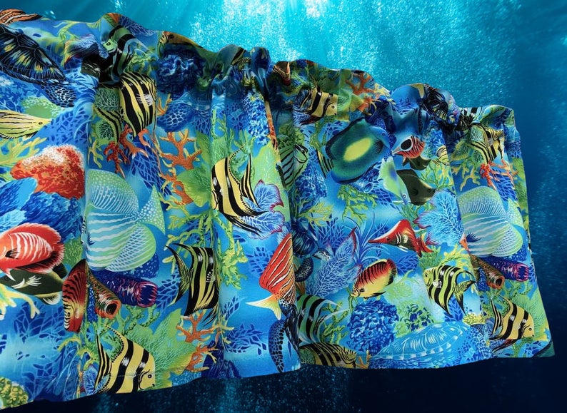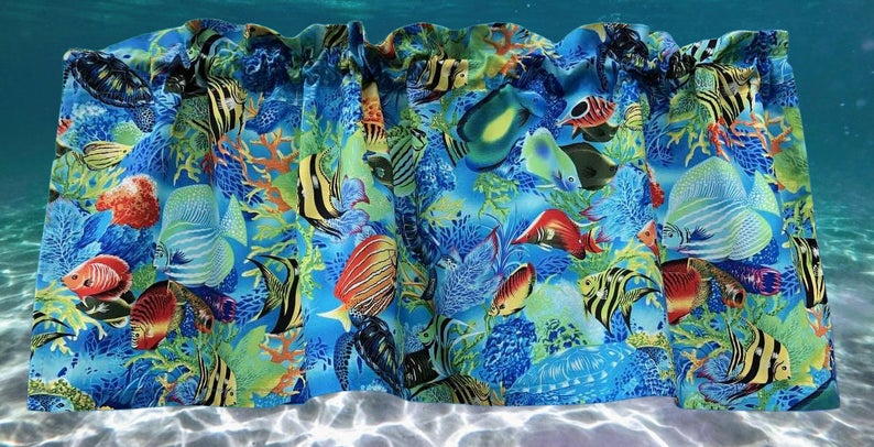 Tropical Fish Valance Beach Island Decor Blue Green Curtain Valance Tier Panel OR Pillow Sham Cover