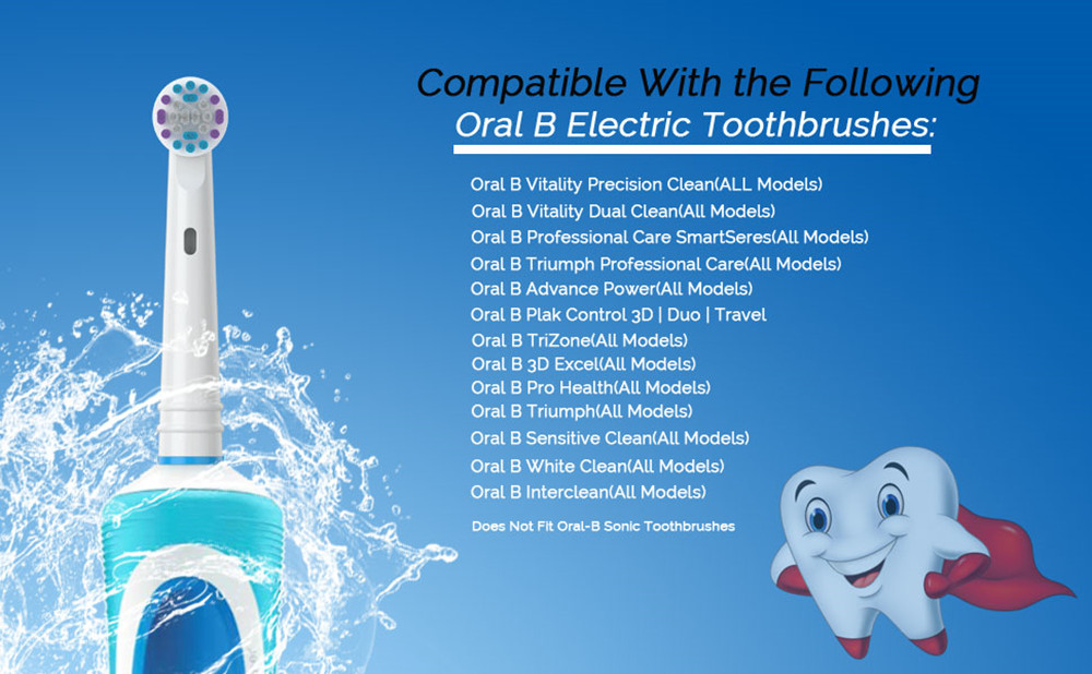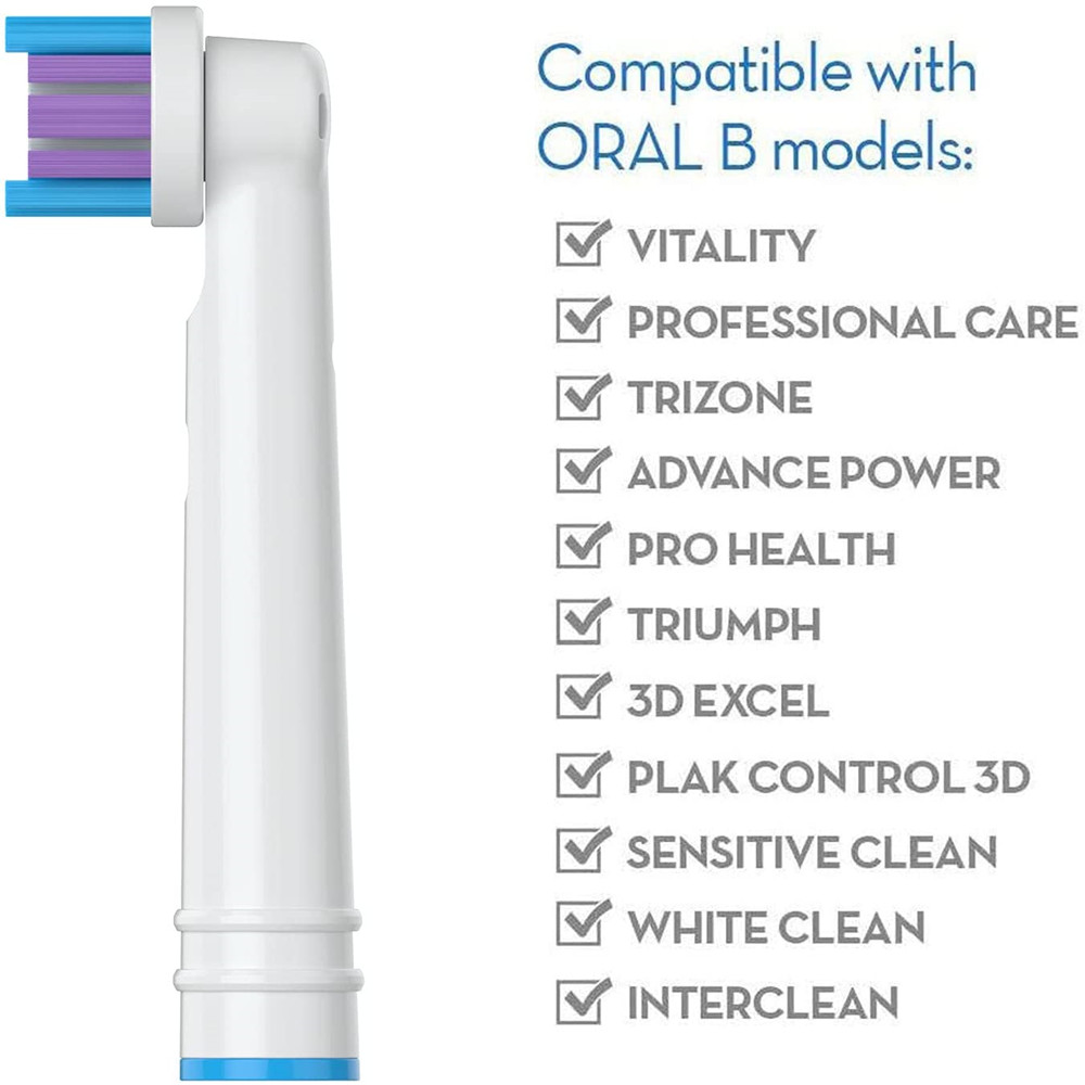 6)Compatible With The Following Oral B Electric Toothbrushes: Vitality Precision Clean, Vitality Dual Clean, Professional Care, Professional Care SmartSeries, TriZone, Advance Power, Pro Health, Triumph, 3D Excel, Plak Control 3D | Duo | Travel, Triumph Professional Care, Sensitive Clean, Interclean, Pro-Health,
