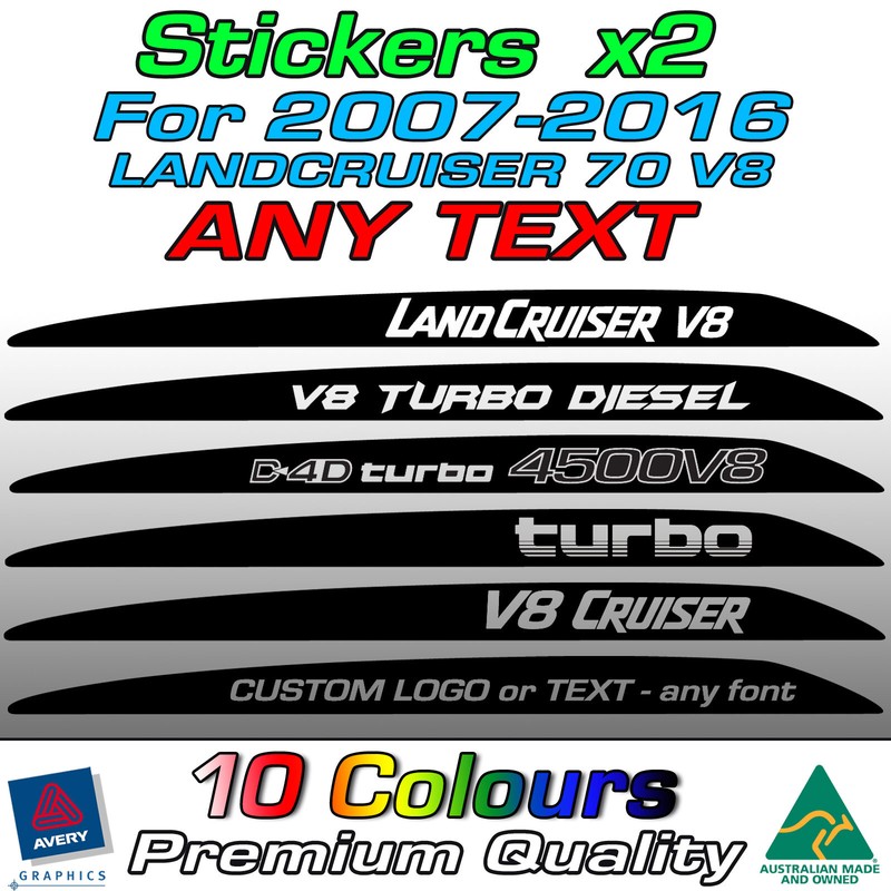 These stickers are for application to the side of the bonnet scoop/bulge on the Toyota LandCruiser 70-series V8 (ie: the 76, 78 and 79).