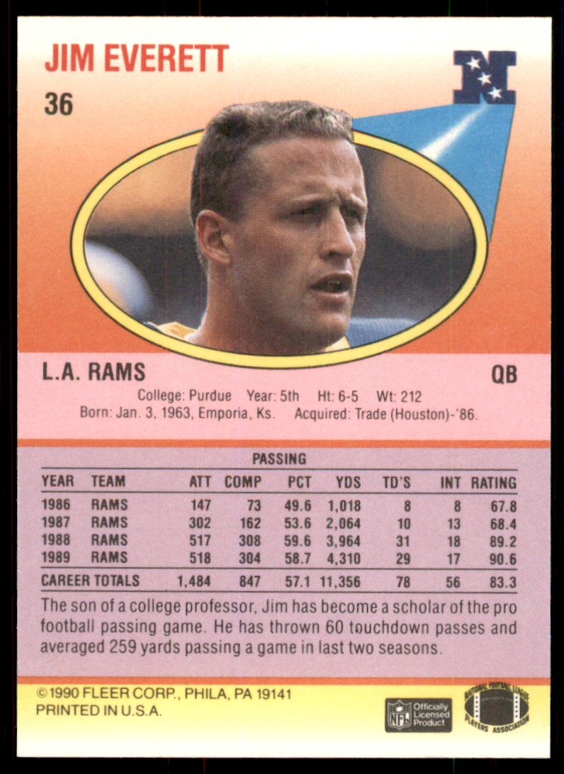 | Description: | Jim Everett | | Category: | Football | | Year: | 1990 | | Product: | Fleer | | Team: | Los Angeles Rams | | Card Number: | 36 | | Dimensions: | 3½" x 2½" |