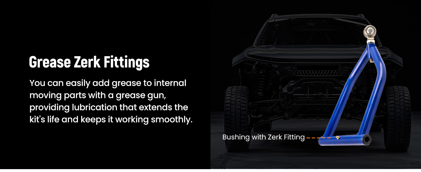 - This front extended a-arm kit includes zerk fittings, easy to inject grease lubricant and grease the bushings