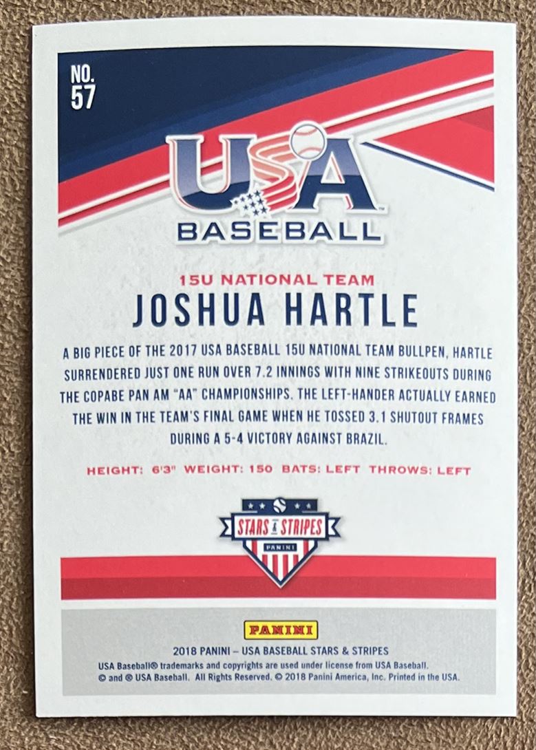 | Description: | Joshua Hartle | | Category: | Baseball | | Year: | 2018 | | Product: | Panini Stars & Stripes Longevity | | Card Number: | 57 | | Rookie: | Yes | | Dimensions: | 3½" x 2½" |