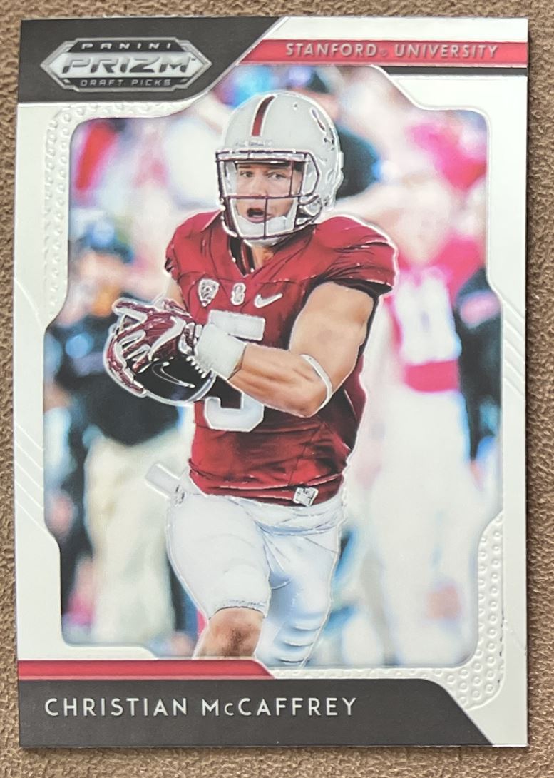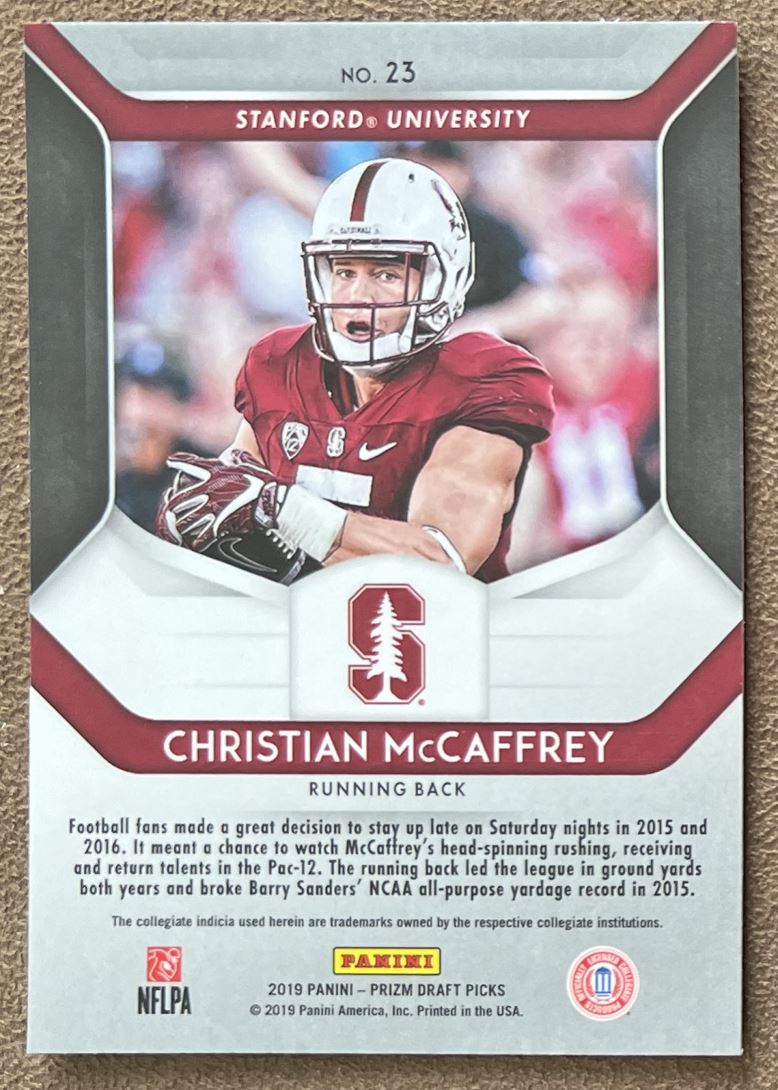 | Description: | Christian McCaffrey | | Category: | Football | | Year: | 2019 | | Product: | Panini Prizm Draft Picks | | Team: | Stanford Cardinal | | Card Number: | 23 | | Dimensions: | 3½" x 2½" |
