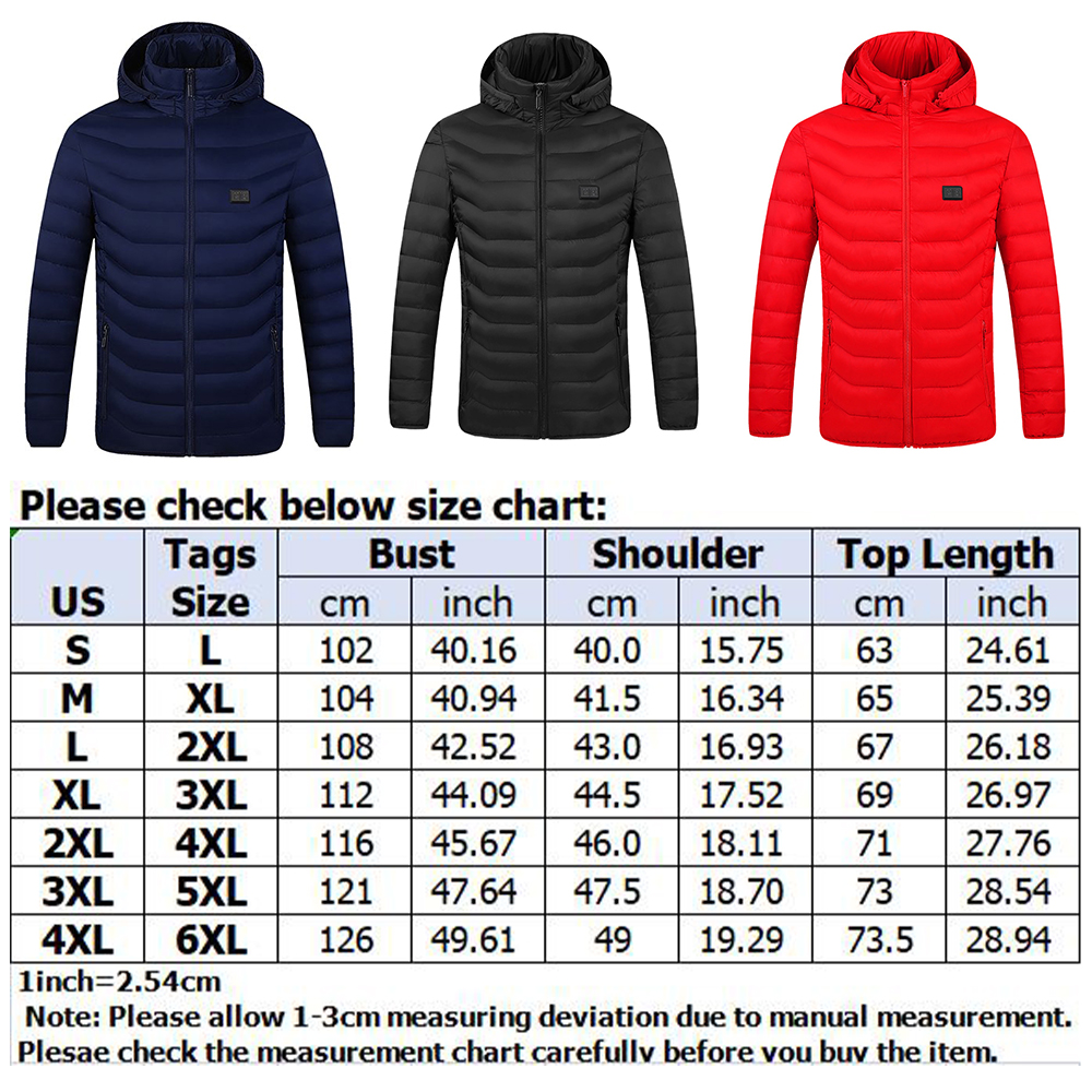 Specifications: Condition: 100% Brand New and High Quality Style: Hooded Heated Coat Material: Nylon Color: Black, Blue, Red(Optional) Size: S,M,L,XL,2XL,3XL,4XL,5XL,6XL(Follow the size chart to select please) Gender: Adults Unisex Power Supply: 5V/2A Mobile Power(Not Included) 11Heated Area: Neck, Shoulder, Arm, Back, Abdomen, And Waist. When The Power Is Turned On, The Whole Body Can Feel The Warm. 3 Modes Temperature: Warm(Red Light), Comfort (White Light), Energy Saving(Blue Light) Description: 11 Areas Electric Heated Hooded Jackets USB Electric Heating Hooded Cotton Coat Camping Hiking Hunting Thermal Warmer Jacket Features: 1. Adopted infrared carbon fibre heating material, which is heat-resistance, wear resistance and can warm up rapidly. 2. Soft and warm inner fabric offers you great comfort. 3. Three gears temperature control, red led for high gear, white led for middle gear, Blue led for low gear. 4. You can use your own power bank to charge the coat . (NOTE: power bank is not included).The USB plug is compatible with most power bank in the market. 5. This coat will start heating in seconds when powered on. it’s widely compatible for outdoor skiing, winter fishing, mountain motorcycle, bicycle, camping, snow hiking, hunting, outdoor attendance, winter street, office daily, etc that meets all your needs. Washing Instructions: 1. Take out the power bank. 2. Do not force knead or beat. 3. After nature air drying can be use. 4. Machine wash & hand wash are available, make sure it is dried before heating. Package Included: 1 x Heating Coat (Power Bank is Not Included) Note: 1. Please allow 1-2cm measuring deviation due to manual measurement. 2. Due to the different monitor and light effect, the actual color of the item might be slight different from the color shown on the pictures. 3. Batteries, connecting plugs and chargers should aviod contact with water during operation. It should be used in completely dry condition. 4. Please DO NOT disassemble, modify the heating film and control circuit, to prevent man-made damage to hot components. 5. The cable is waterproof, can be washed. 6. Always connect it to the power bank when heating. 7. Power bank is not included in the product.