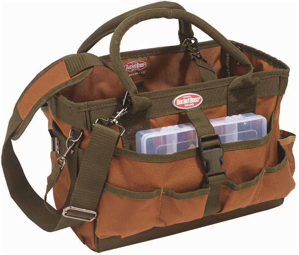 The Bucket Boss Gatemouth 16 in. Soft Tote was designed with having quick and easy access to your tools. Made of rugged ripstop/600D only material, durability wont be an issue. It has 12-pockets and 16-tool loops, a large interior space with an adjustable/removable partition. Its also equipped with a tape clip, electrical tape holder and a tool clip. There is also a plastic small parts tray included so you can keep nails, screws, caps and other items that can be easily lost contained. Finally, the padded shoulder strap makes it easy to transport your tools while on the job.