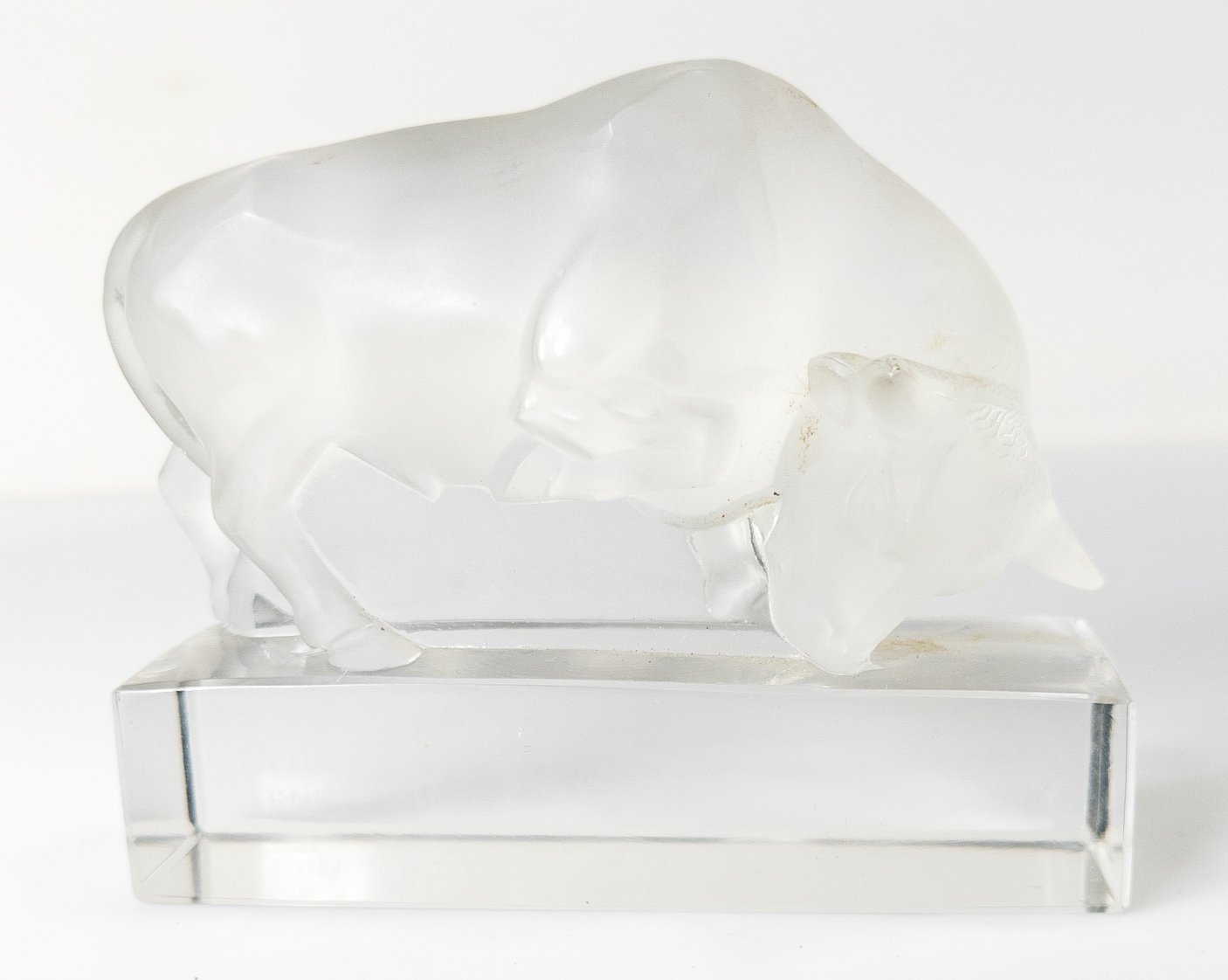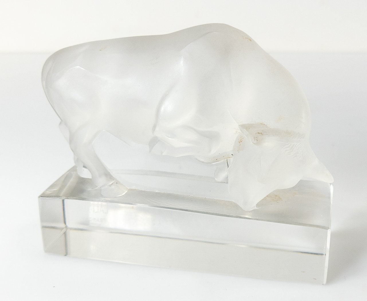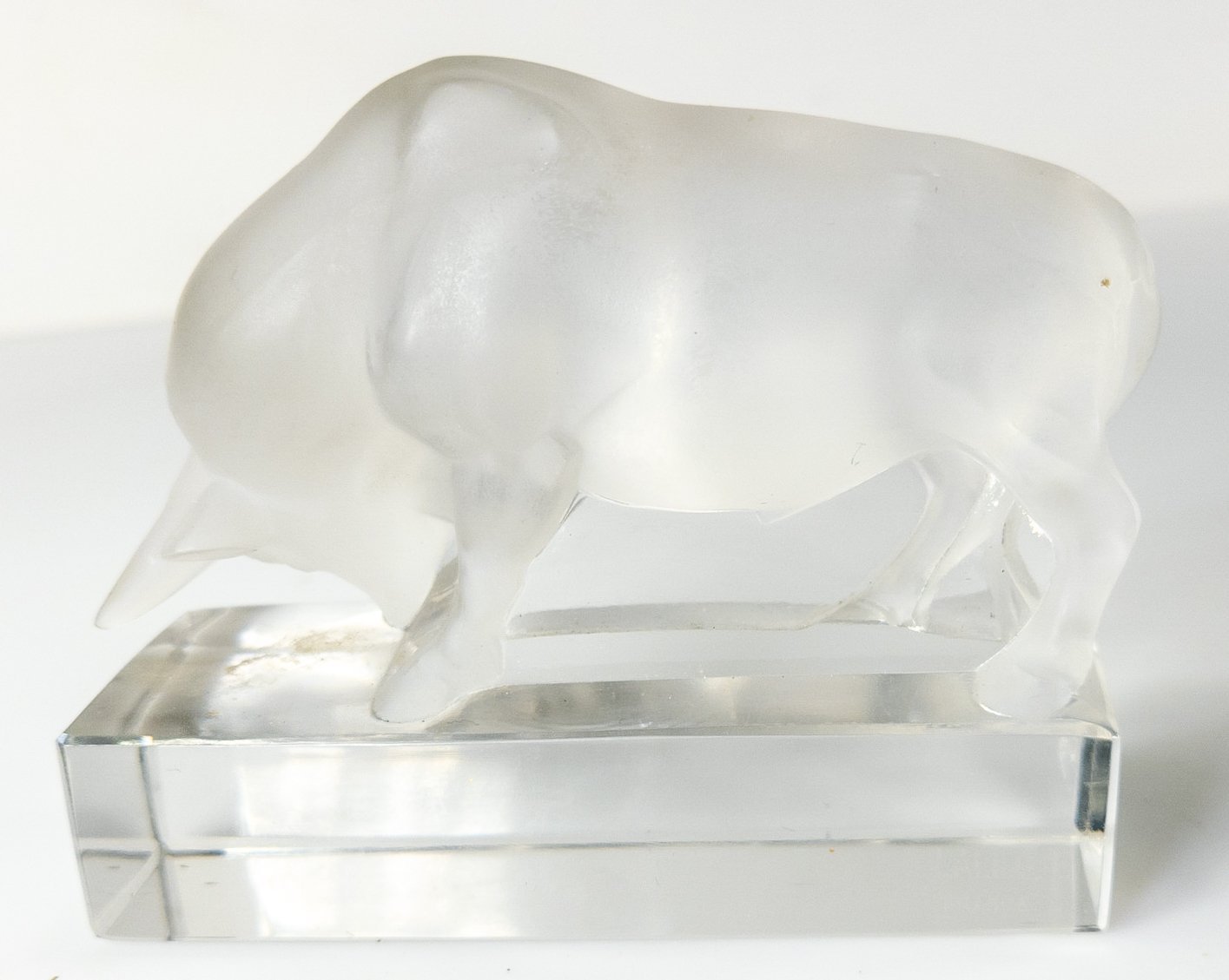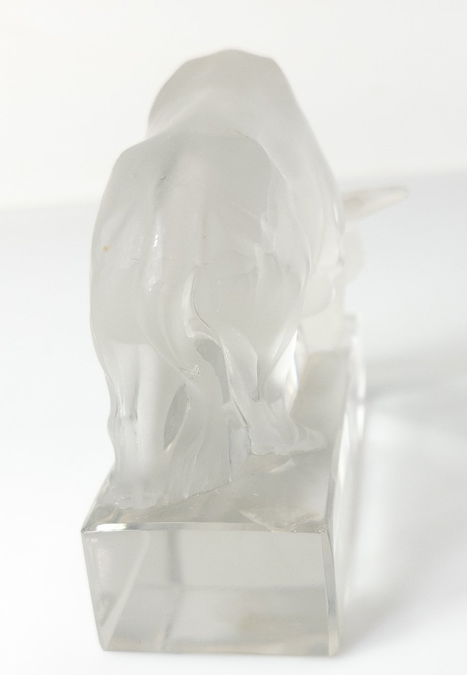 We are selling this vintage mid-century French frosted glass figure of a raging bull by Lalique with acid signature.