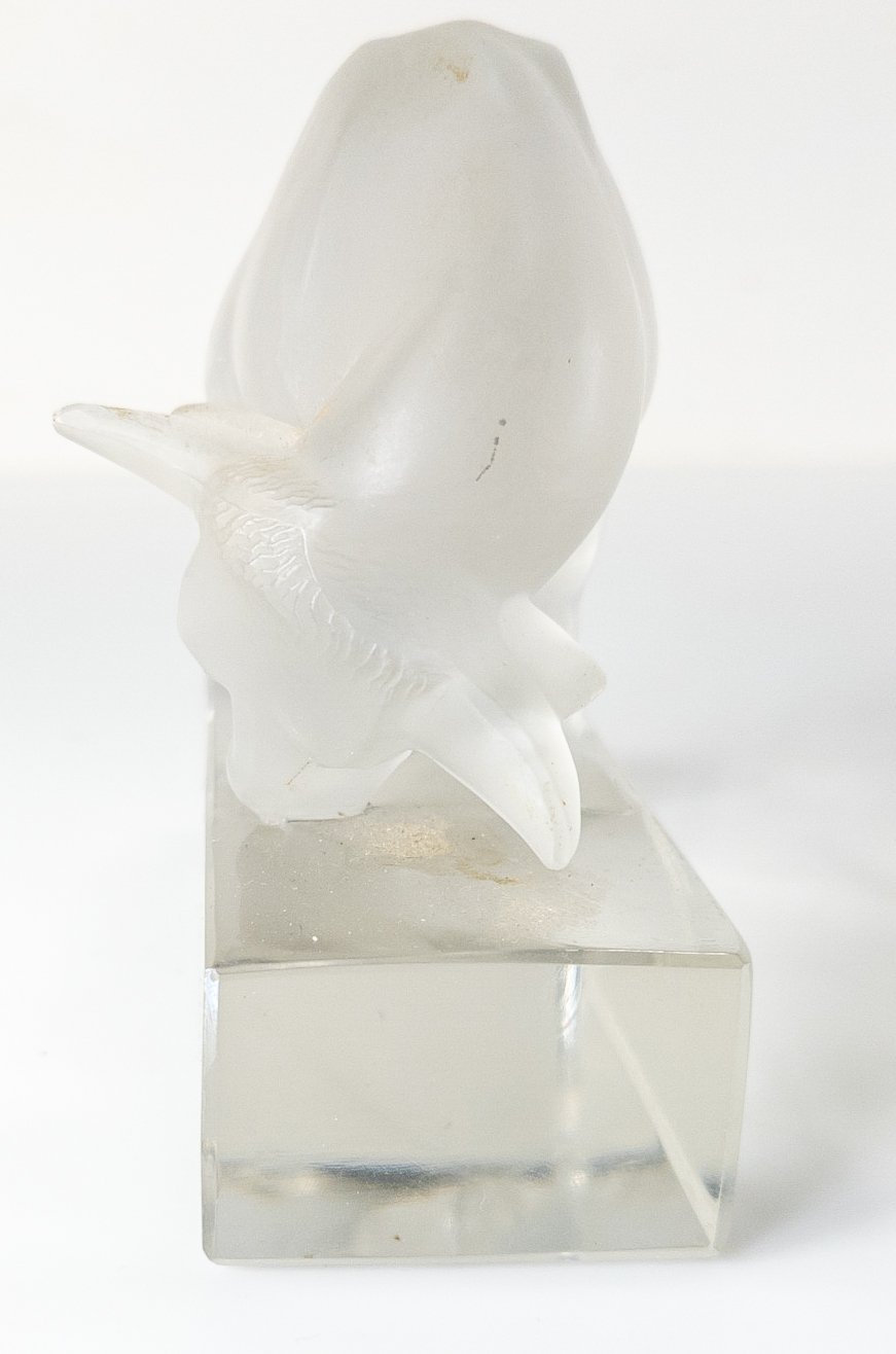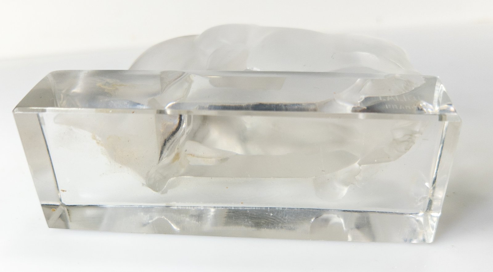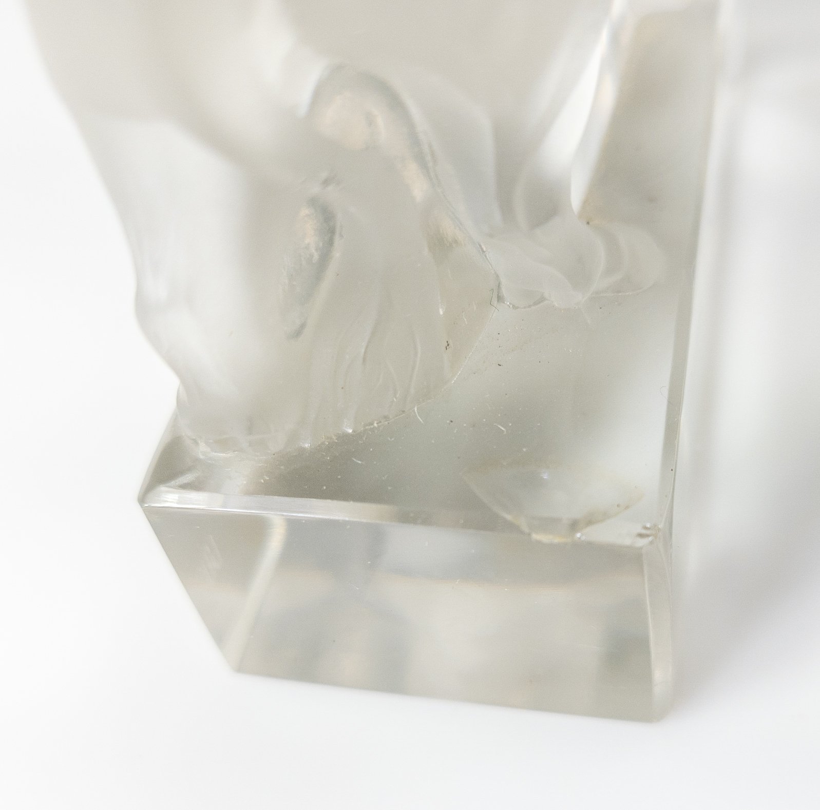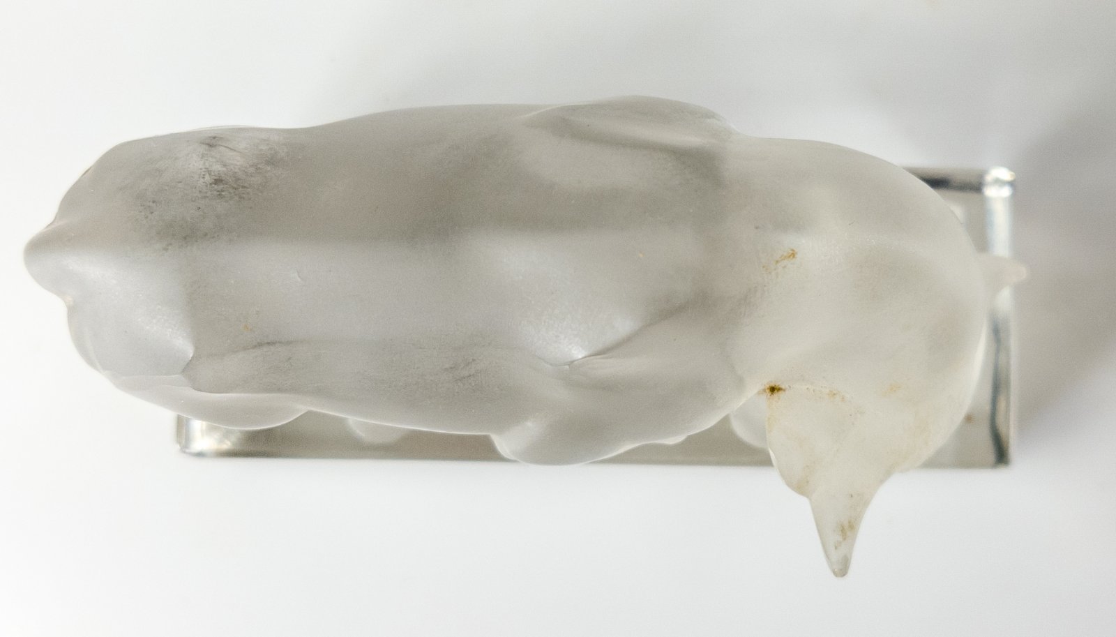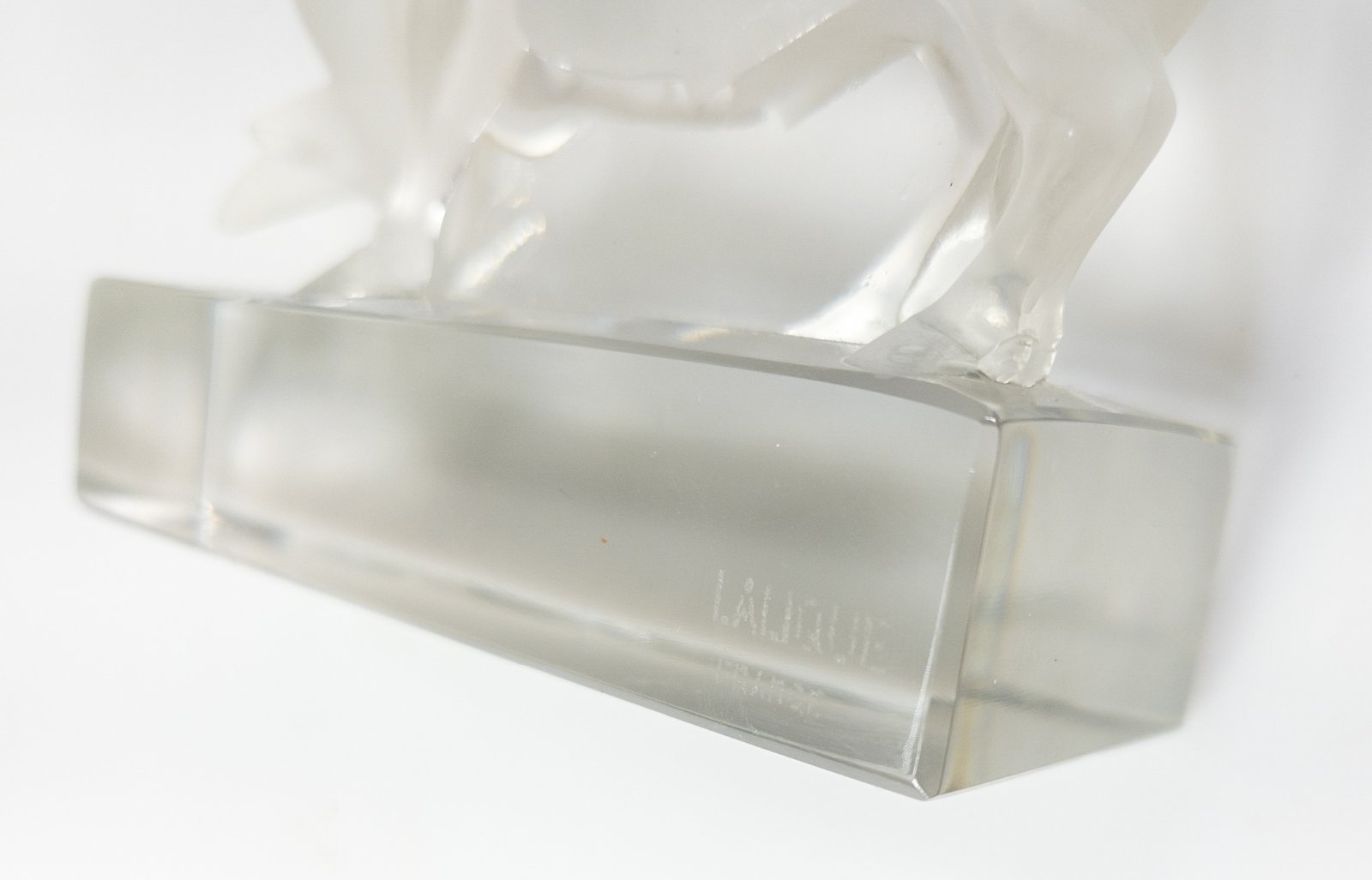We are selling this vintage mid-century French frosted glass figure of a raging bull by Lalique with acid signature.