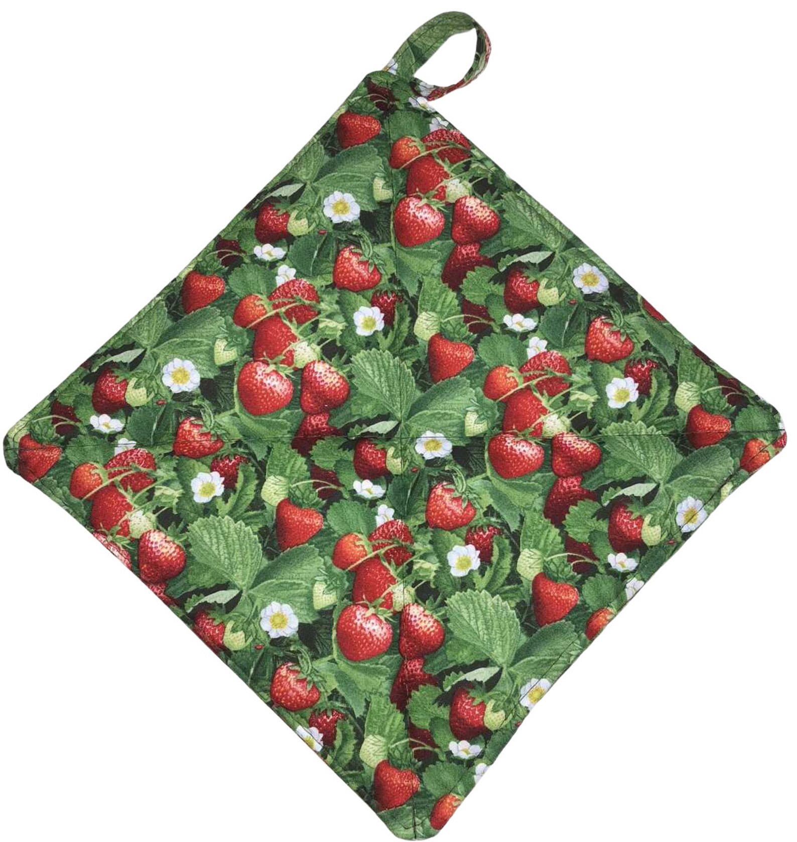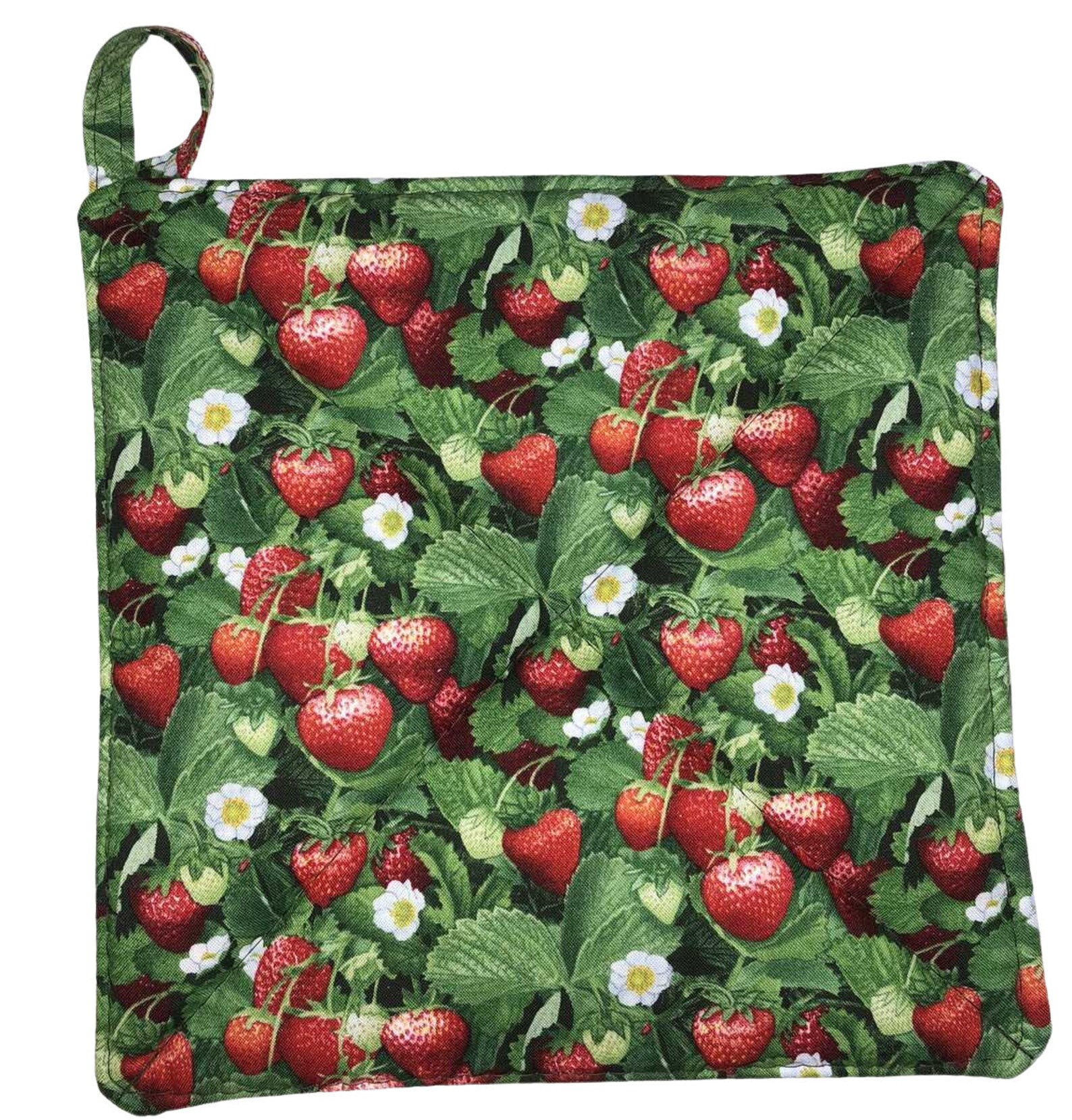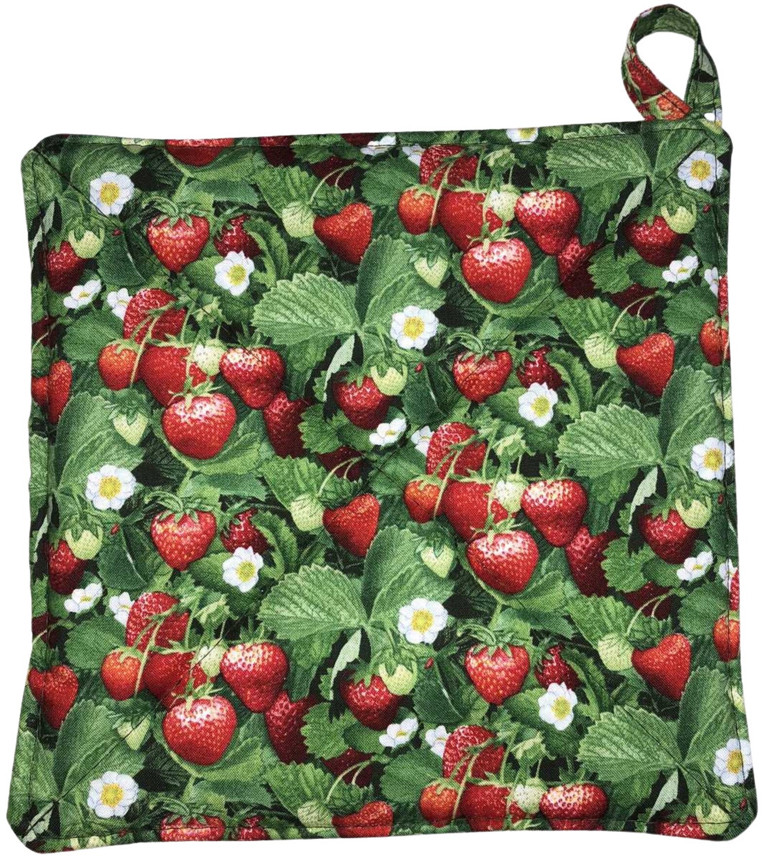 Featuring images of red strawberries with a green leaf background with white flowering blooms. Pot Holder looks like a strawberry picking field. This would make a great gift for those that put up strawberry jams and jellies every year - or for those making that delicious homemade strawberry cobbler / pie or ice cream!
