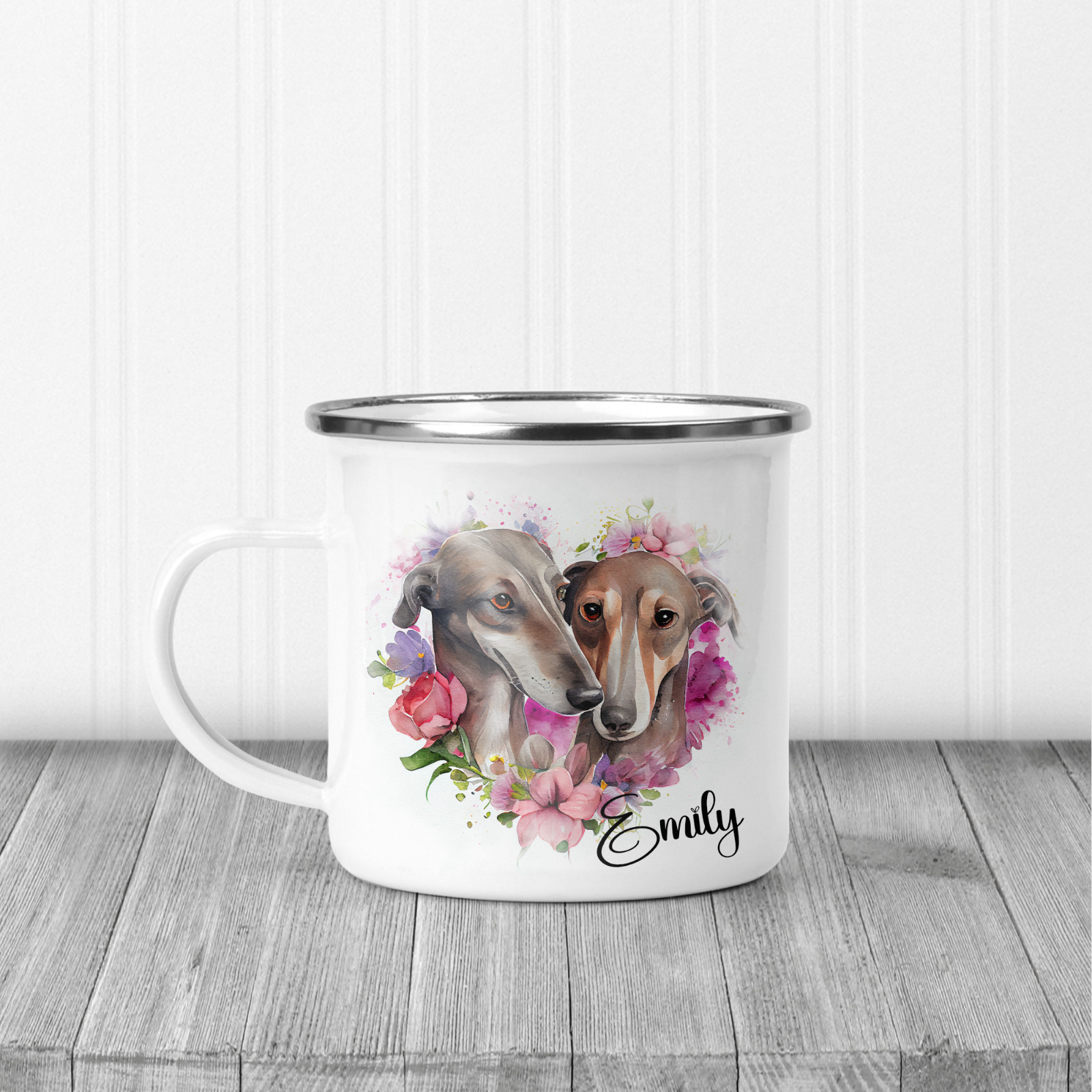 12oz enamel mugs with silver rim.