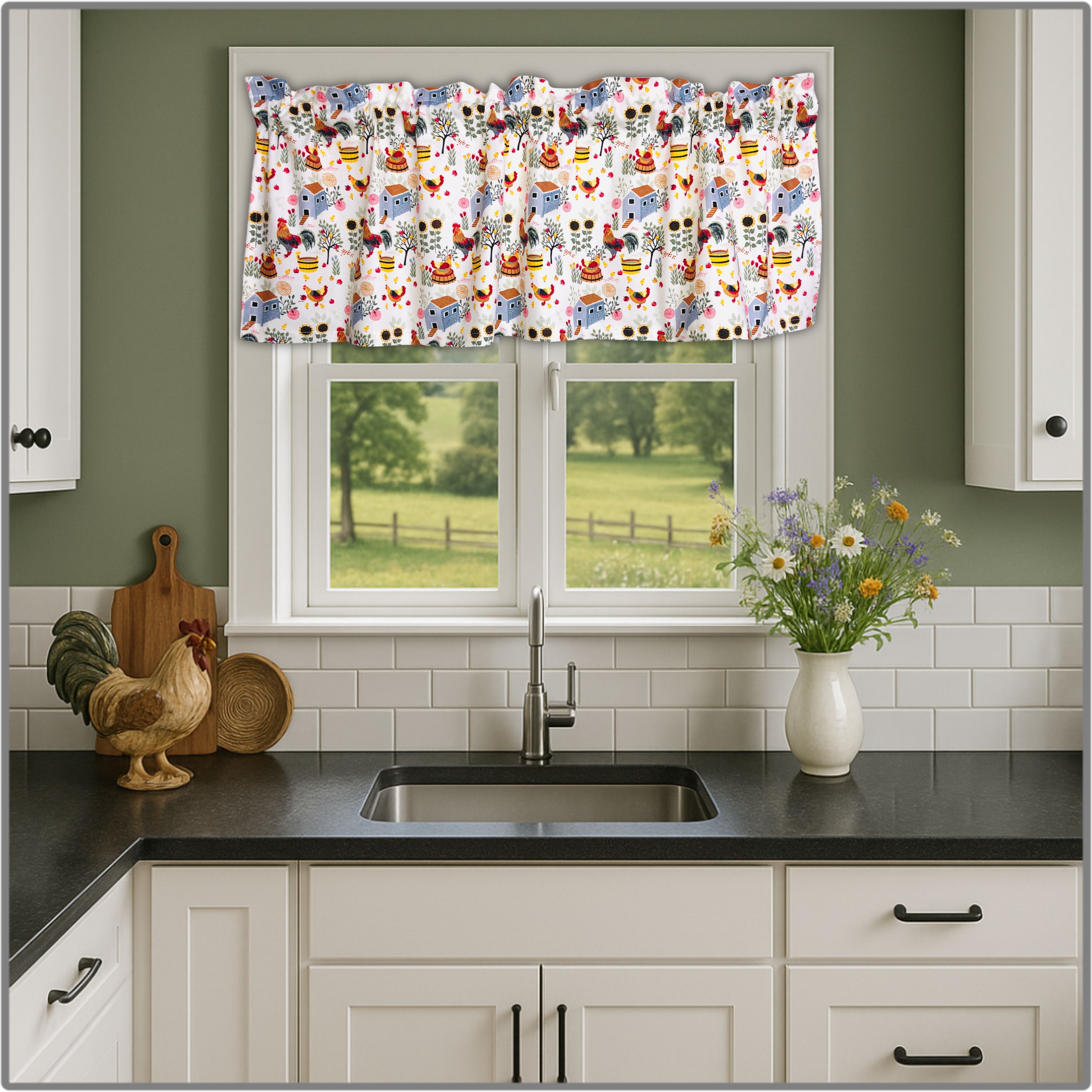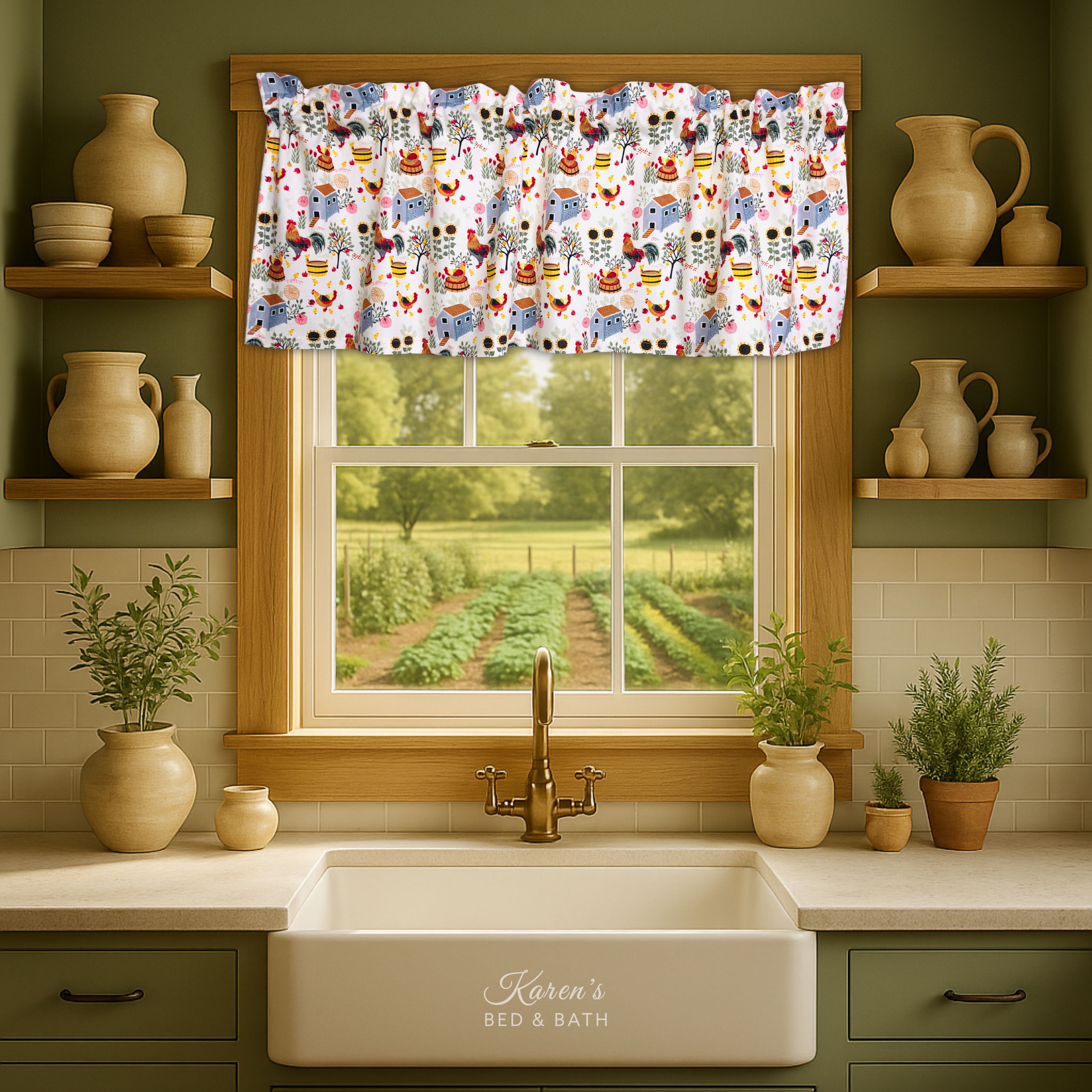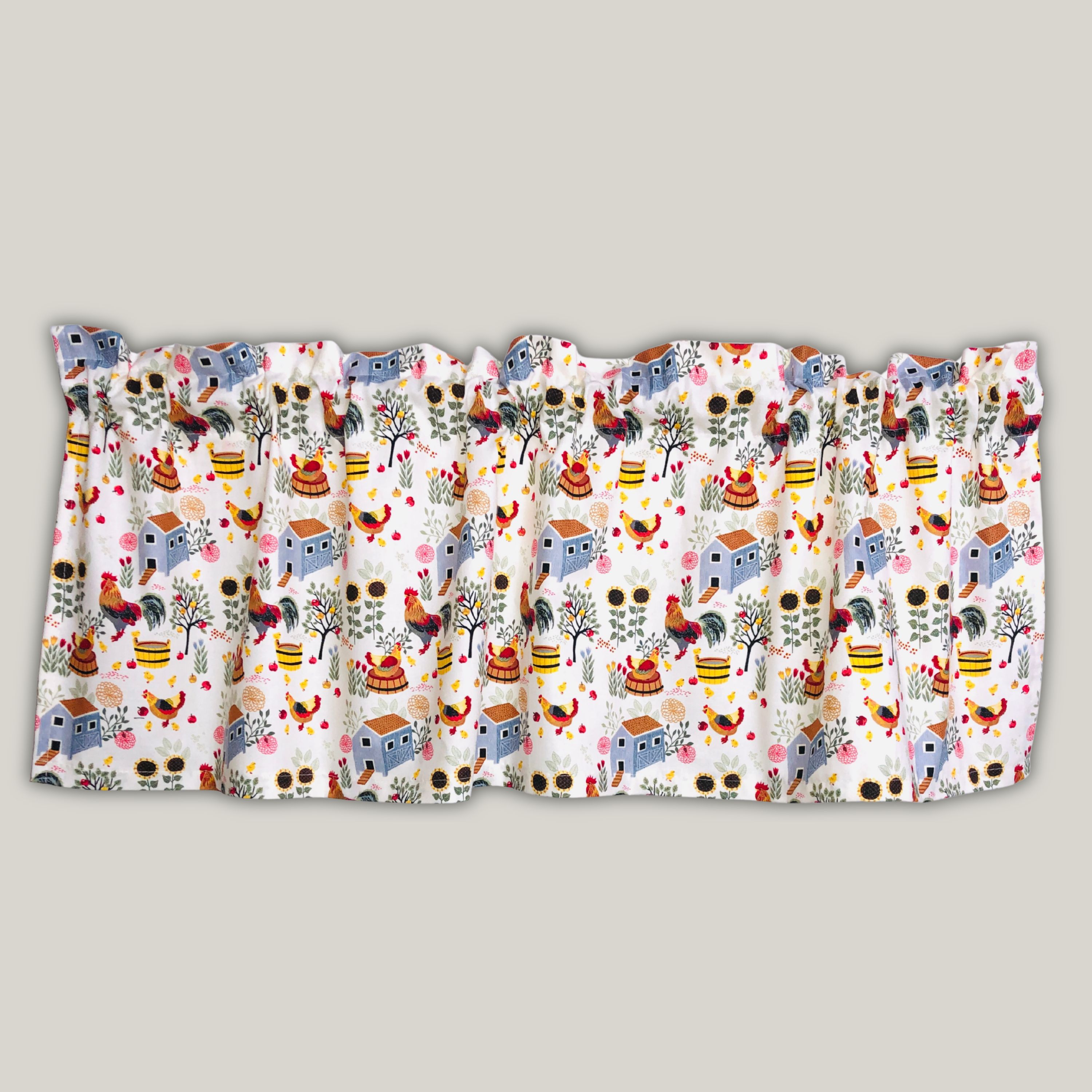 Add cheerful farmhouse charm to your kitchen, breakfast nook, laundry room, or country cottage with this adorable handmade valance. This print features roosters, hens, fluffy baby chicks, apple trees, sunflowers, and little blue barns — all arranged on a soft white background. It’s playful, warm, and perfect for farmhouse or rustic-country décor.