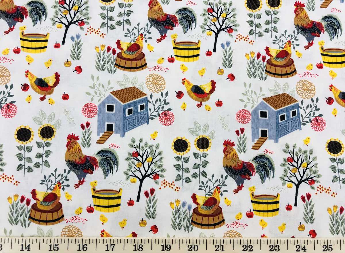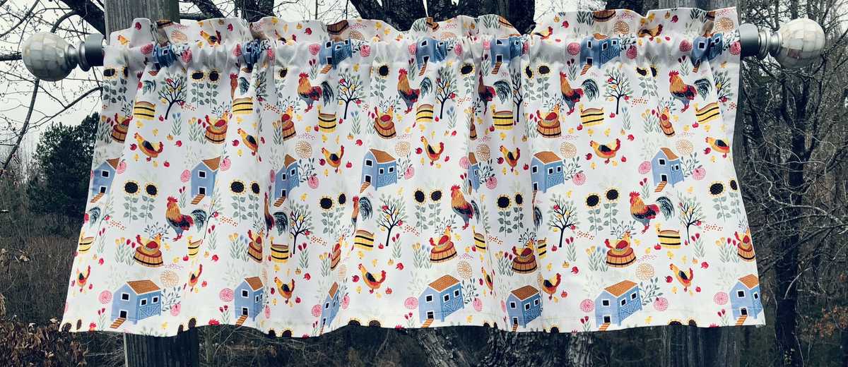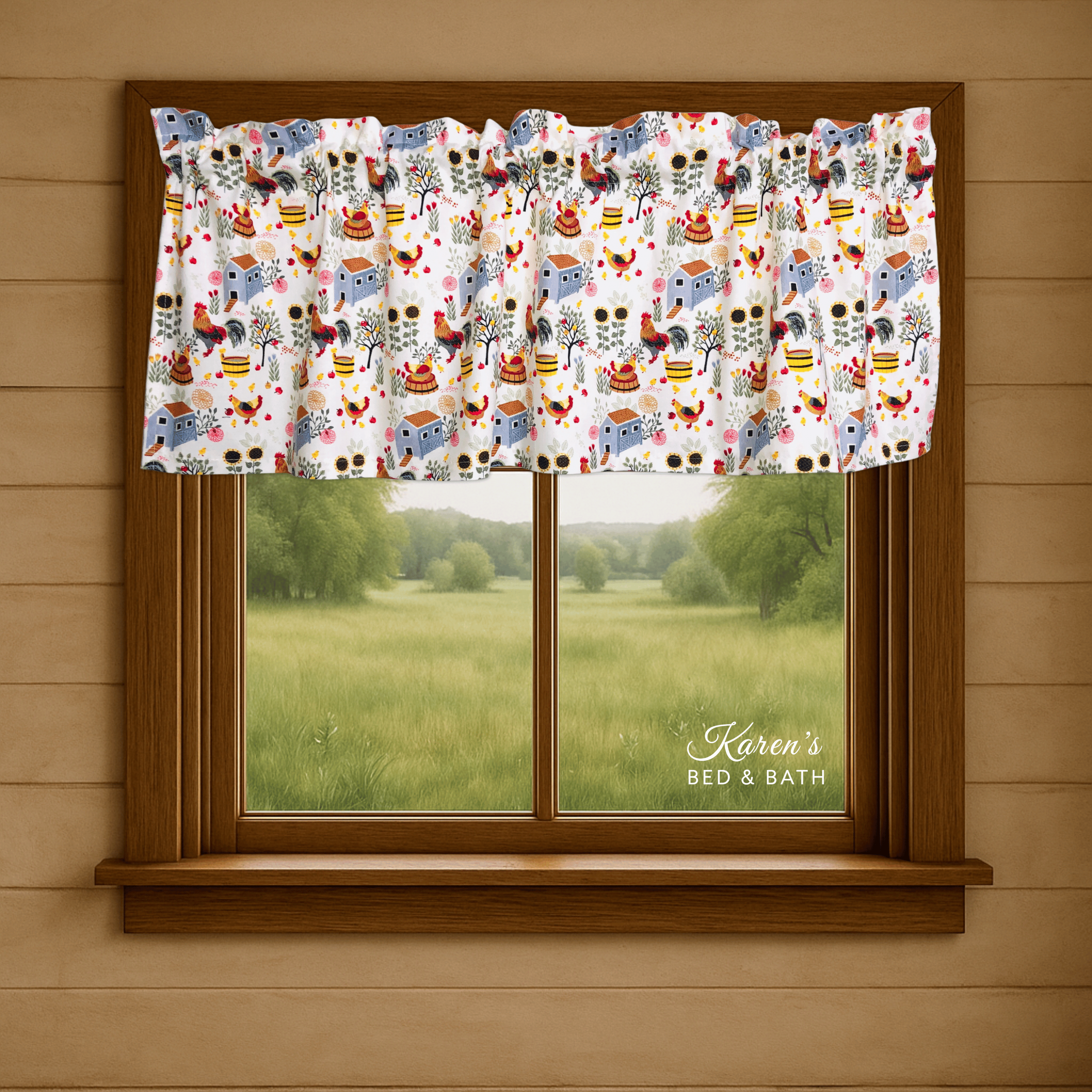 Add cheerful farmhouse charm to your kitchen, breakfast nook, laundry room, or country cottage with this adorable handmade valance. This print features roosters, hens, fluffy baby chicks, apple trees, sunflowers, and little blue barns — all arranged on a soft white background. It’s playful, warm, and perfect for farmhouse or rustic-country décor.