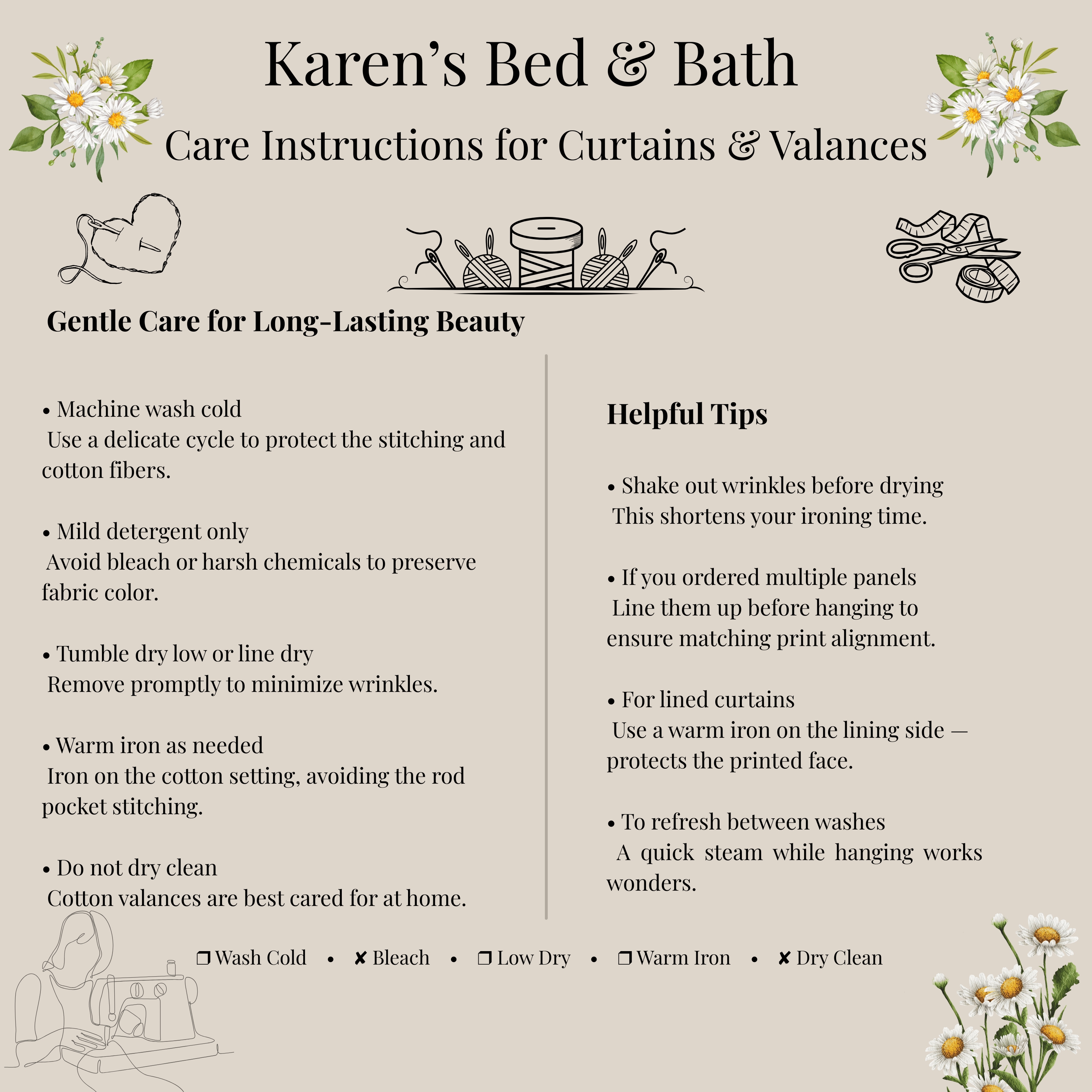 Each valance is professionally sewn in my North Carolina workroom with careful attention to print alignment and fullness.