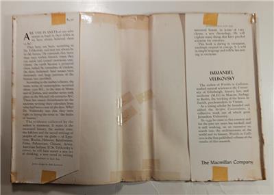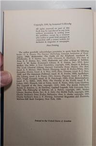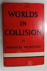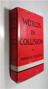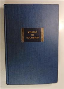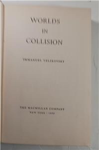 WORLDS IN COLLISION BY IMMANUEL VELIKOVSKY AND PUBLISHED BY THE MACMILLAN COMPANY IN 1950 FIRST PRINTING OF THE FIRST EDITION IN DUST JACKET WITH ORIGINAL PRICE OF $4.50 NOT CLIPPED. SCARCE BOOK ON THE THEORY OF COLLIDING PLANETS OF THE SOLAR SYSTEM. SCARCE! BOOK IS IN GOOD TO VERY GOOD CONDITION WITH OLD TAPE GHOSTS ON THE ENDPAPERS, NAME AND INSCRIPTION ON FRONT FREE ENDPAPER, SHELF WEAR. DUST JACKET IS IN GOOD CONDITION BUT WITH TAPE ON EDGES AND REVERSE, EDGE AND SPINE TEARS/CHIPS, POSTAGE $12.50 IN THE UNITED STATES AND BY ARRANGEMENT OVERSEAS. PAYMENT CAN BE MADE BY PAYPAL........ GOOD LUCK!