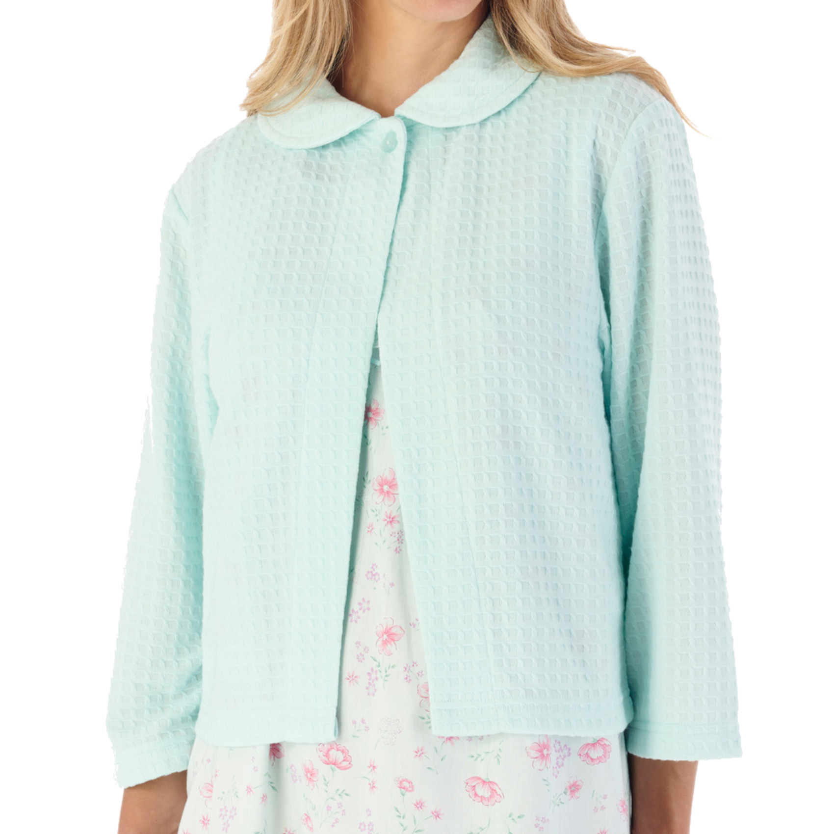 These ladies waffle knit bed jackets by Slenderella have a button fastening, a collar and three quarter length sleeves.