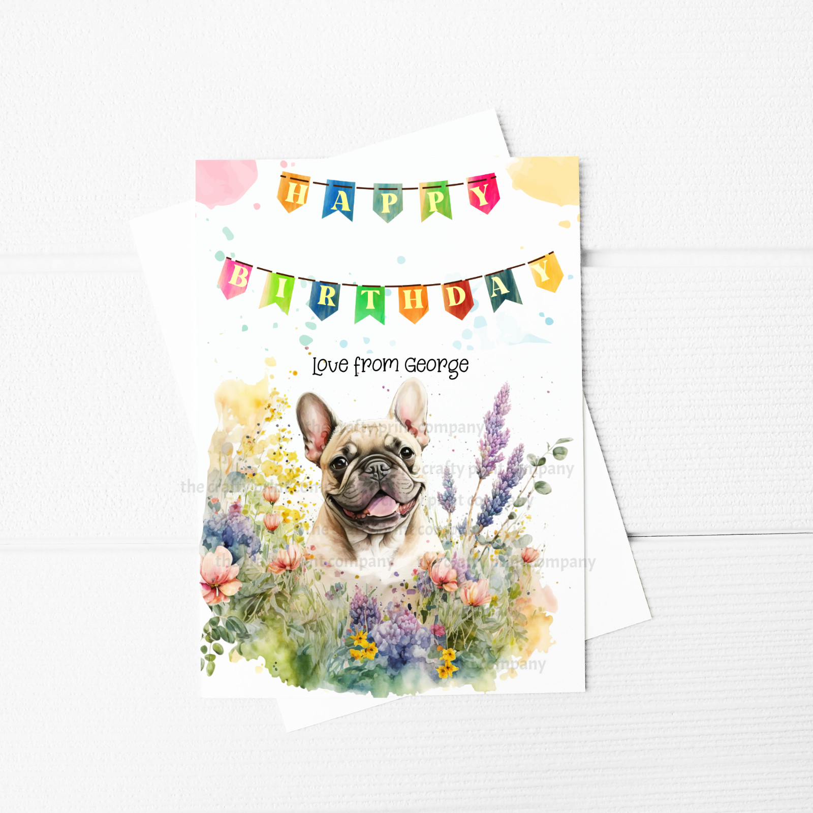 Happy Birthday personalised A5 Greeting Card with a French Bulldog in Flowers design on it