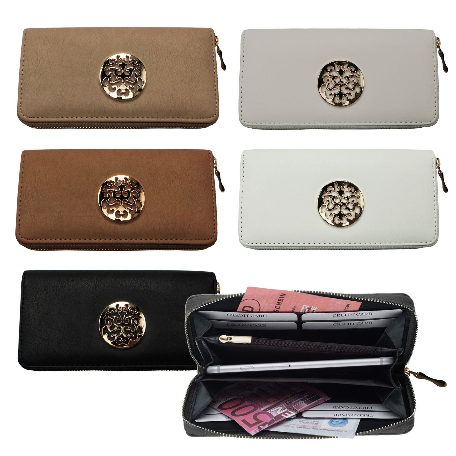 La billetera de moda hecha de cuero sintético duro está disponible en los 4 colores metálicos polvorientos diferentes: oro, plata, cobre o níquel. Las letras en relieve "Donna" adorna el frente de una manera sutil. Con las dimensiones de (b/h/t) aprox. 19 x 10 x2.5 cm en el largo formato de paisaje es fácil de encontrar en el bolso o se puede aprovechar prácticamente debajo del brazo. Ofrece suficiente espacio para todas las cosas importantes. La cremallera de color dorado con todo el oro esconde los compartimentos de almacenamiento claramente dispuestos para notas, monedas y mapas. Por lo tanto, encontrará 2 compartimentos para billetes, ID o documentos con 4 compartimentos de tarjetas y un gran compartimento de gasolina, 1 compartimento interno de monedas con cremallera y un compartimento ancho para teléfonos celulares u otros utensilios. Al hacerlo, mantienes todo lo que quieres llevar contigo todo el tiempo, en el que el espacio destinado a esto es claro y seguro. La mano de obra de alta calidad y el material fácil y fácil de poliuretano (PU) son los mejores requisitos previos para el uso de larga duración y una larga alegría en la billetera. Tenga en cuenta que puede haber desviaciones de color en la pantalla debido a diferentes configuraciones de monitor.