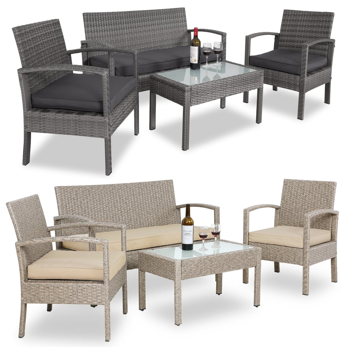 Der Experimentierfreude sind keine Grenzen gesetzt! Zwei Eckmodule und vier Sitzelemente mit großen, weichen Auflagen und Kissen lassen sich mit Hilfe von Verbindungsclips stabil zu individuellen Landschaften kombinieren. Das edle Ensemble wird durch einen Tisch mit einem Korpus aus Polyrattan und einer Platte aus gehärtetem Glas abgerundet.