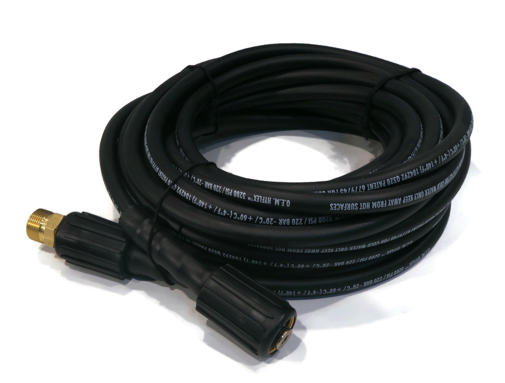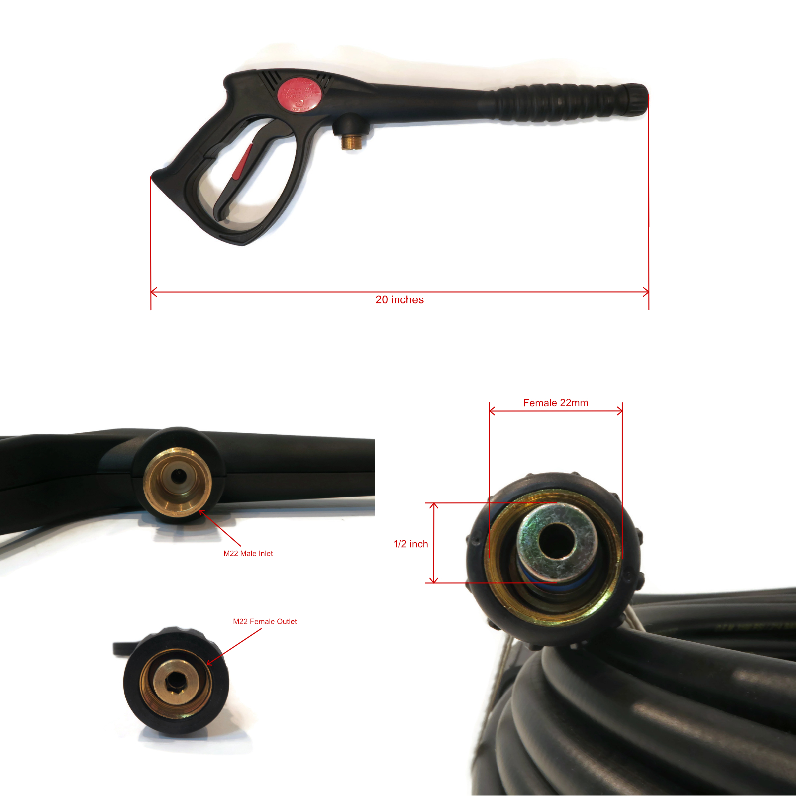 • Specs - Spray Gun - Inlet: M22 male. Outlet: M22 female. Max PSI: 3000. Max Temperature: 140° F (60° C). Max GPM: 7. Hose - Length: 35'. End Types: M22 Female, Threaded. Diameter: 1/4" (6mm). Max Pressure: 3200 PSI. Wand - Length: 18". Male Pipe Thread Inlet: M22. Female Quick-Connect Outlet: 1/4". Max GPM: 10.5. Max PSI: 4000. Max Temperature: 300° F (150° C). Refer to images 2 & 3 for more information
