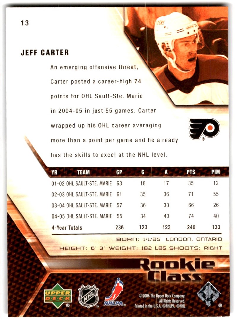 | 2005-06 Upper Deck Class Box Set Jeff Carter Rookie #13 Philadelphia Flyers |