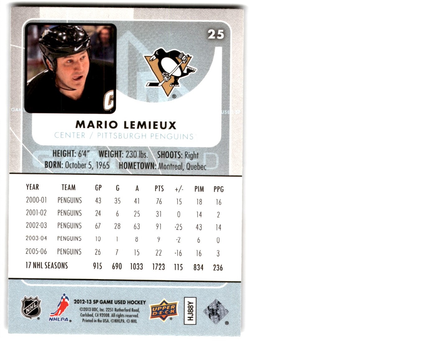 | Description: | Mario Lemieux | | Category: | Hockey | | Year: | 2012 | | Product: | SP Game Used | | Team: | Pittsburgh Penguins | | Card Number: | 25 | | Dimensions: | 3½" x 2½" | | SKU: | HK EB0020 R01 B (69) |