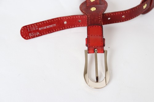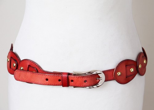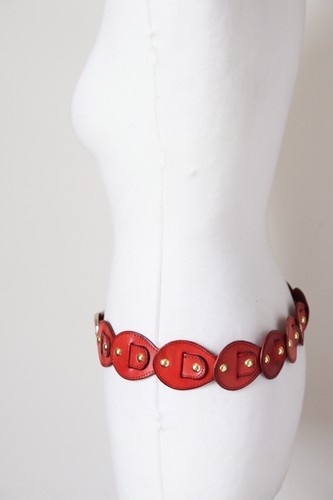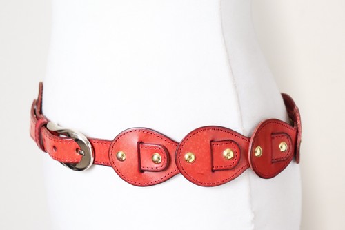 Vintage reddish tan leather belt with gold tone metal studs and a silvery tone buckle.