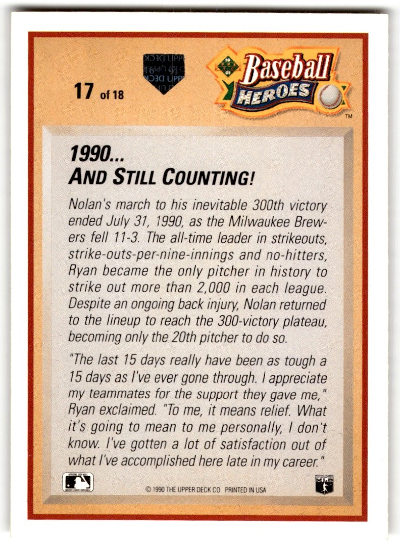 | 1991 Upper Deck Baseball Heroes Nolan Ryan #17 Texas Rangers |