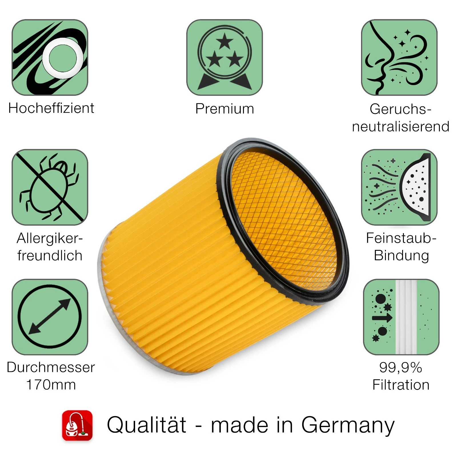 Hochwertiger Lamellenfilter passend für Kärcher und DeWalt Staubsauger. Er schützt den Motor bei jedem Saugen und muss nicht mehr gewechselt werden. Die Saugleistung wird mit diesem Filter erheblich verbessert.