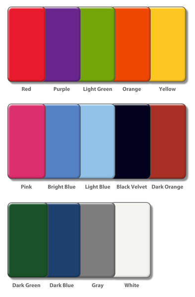 Available in: Red - Purple - Light Green - Orange - Yellow - Pink - Bright Blue - Light Blue - Black Velvet - Dark Orange - Dark Green - Dark Blue - Gray - White