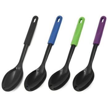 This Chef Craft Nylon Solid Spoon is a great addition to any kitchen. It's perfect to use with pans that have a non-stick coating that you don't want to damage. The black working end will not stain no matter what foods you cook. The solid serving spoon features a comfortable grip plastic handle.