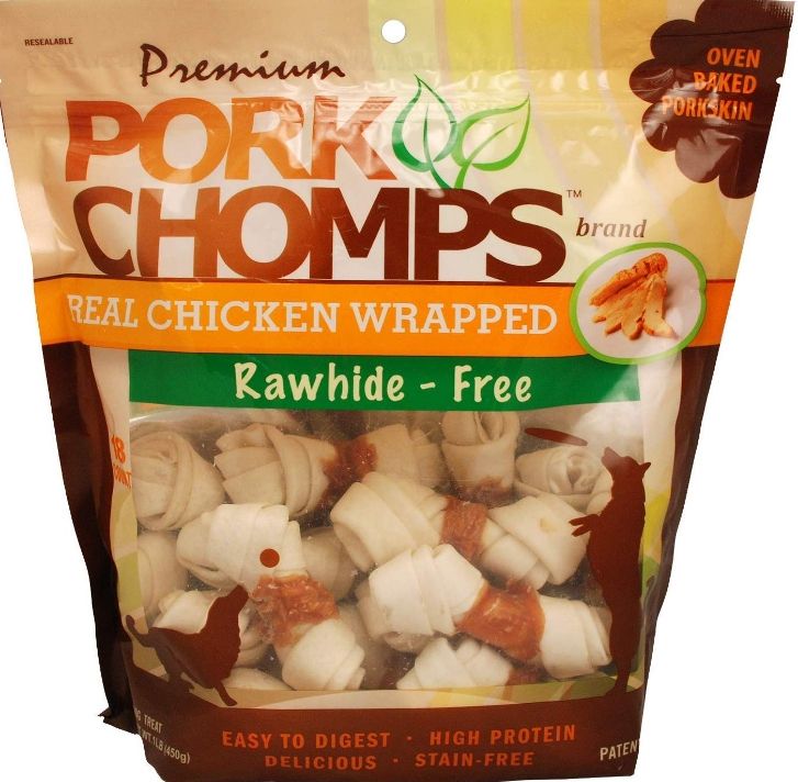 Premium Pork Chomps Real Chicken Wrapped Knotz are rawhide free, made with real chicken and pork skin. Not only are they a great snack high in protein and easy to digest but they also help maintain good dental health. Real chicken wrapped pig skin knotz, what more could your dog ask for!