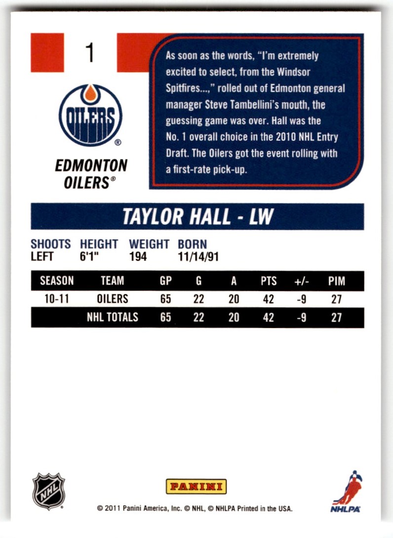 | Description: | Taylor Hall | | Category: | Hockey | | Year: | 2011 | | Product: | Score Highlight | | Team: | Edmonton Oilers | | Card Number: | 1 | | Dimensions: | 3½" x 2½" | | SKU: | HK EB0030 R01 R (3) |