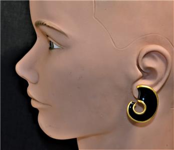 New Old Stock Signed AK ANNE KLEIN Goldtone Black Enamel COMMA Shape Clip-On Earrings
