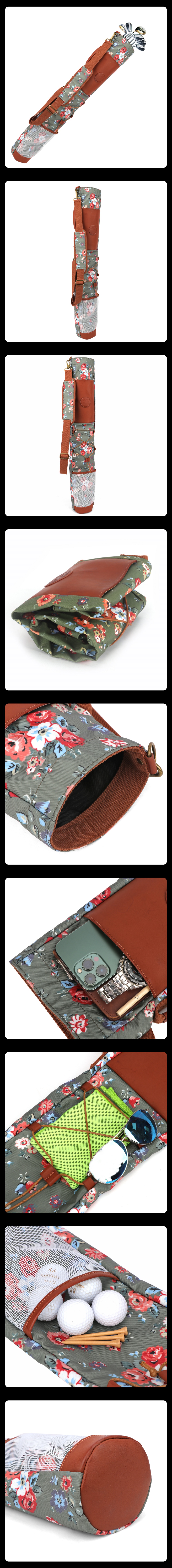 ✅The golf Golf Pitch Putt Carry Bag is made of quality canvas and Microfiber leather.Waterproof microfiber bottom make bag more durable and easy to clean.2 large side pockets to carry your daily essentials or golf accessories such as golf balls, sunglasses case, towel ,tees, pencil and ball marker etc, one of the pouch is in mesh, quick dry and can find your accessories easily.Ultra lightweight construction. When not in use, the collapsible design can be folded up and stored neatly and out of the way.Durable carry handle plus shoulder strap to tote your clubs. ✅Can hold 7~9 golf clubs. ✅This Sunday bag is ideal for training/golfing/game etc.Suitable for both men and women, can be given as gifts to family and friends ✅Size: 83*20*12cm Color: Green flower pattern