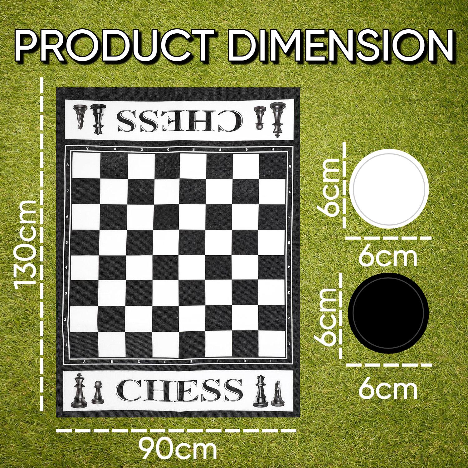 Our giant size chess board size is L 90cm x W 130cm. The round chess pieces have a dimension of 6cm.