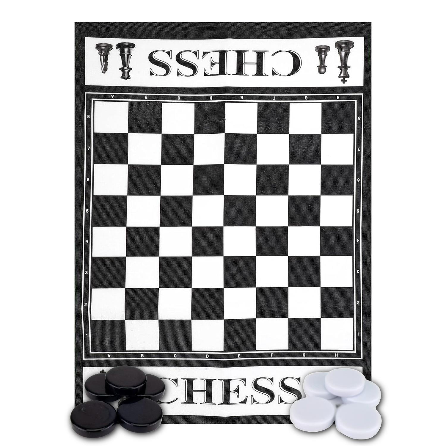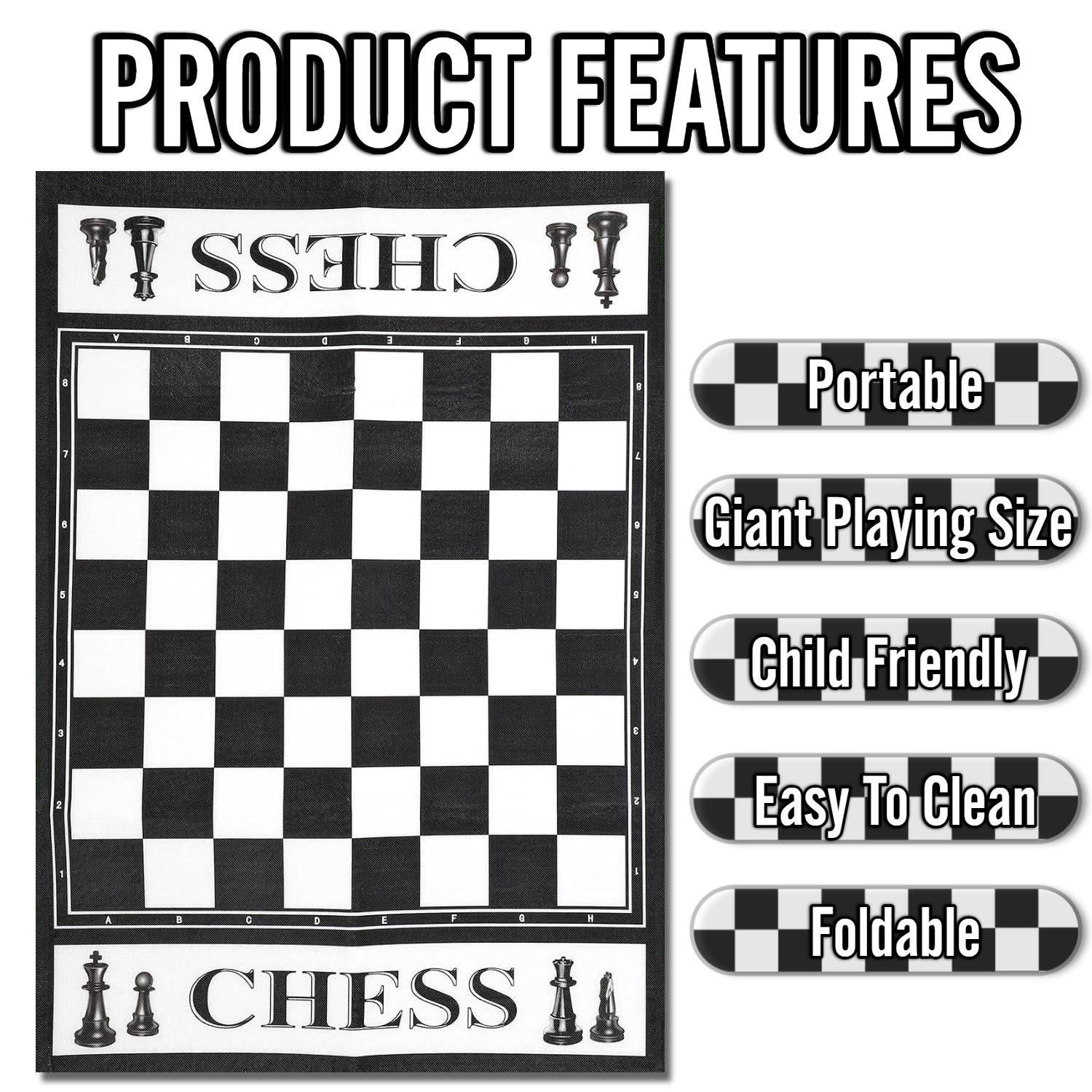 The chessboard is much larger than a standard tabletop chessboard, with an 8x8 grid of squares. The chess board is made up from roll-up fabric. It comes with 32 round chess pieces (16 black and 16 white). Pieces are made from durable, lightweight materials like plastic