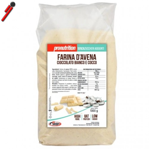 Ingredienti gusto Cioccolato Bianco Cocco: Farina di avena (97%), aromi, sale, Edulcorante: Sucralosio.