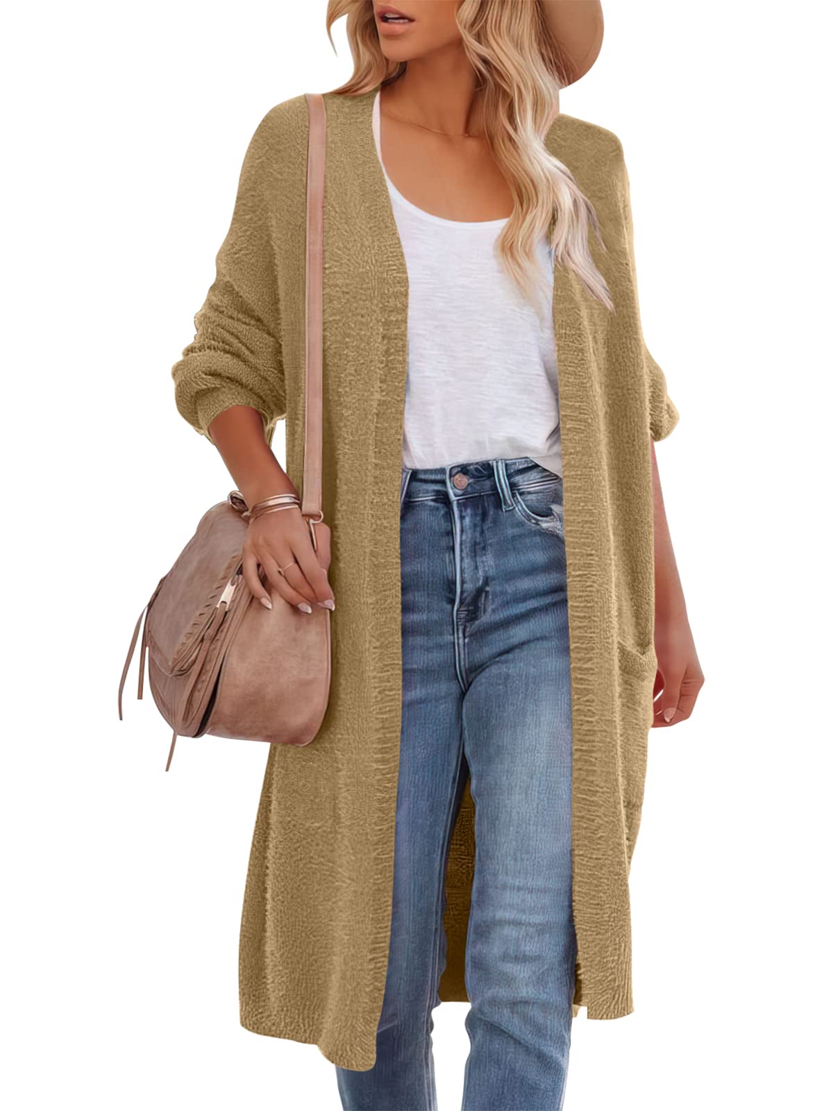 Casual Open Front Fuzzy Knit Cardigan Plush Sweater Coat with Pockets-M Khaki