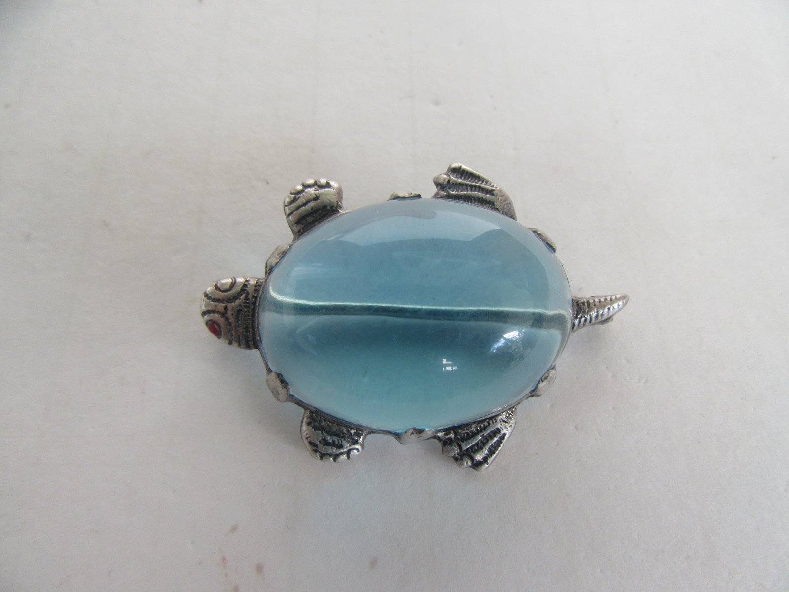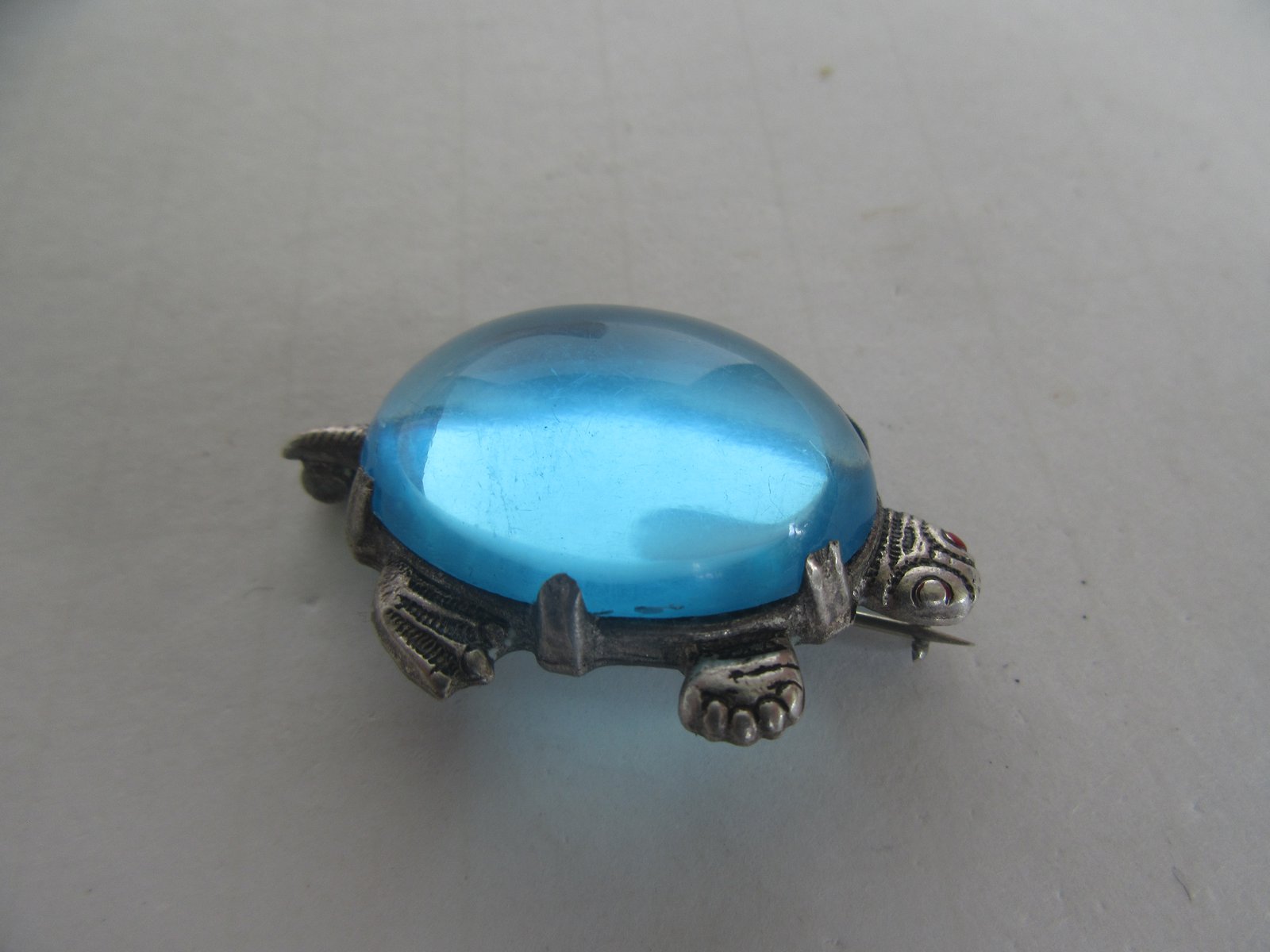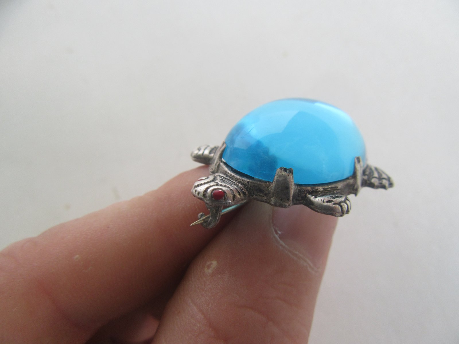 The turtle is unsigned. It came in a grouping of silver jewelry that I purchased, all of it was designer / Southwestern, and it has been tested as sterling. The eyes have red enamel paint, but most of it has rubbed away on the one eye. However, other than that is in very good condition.