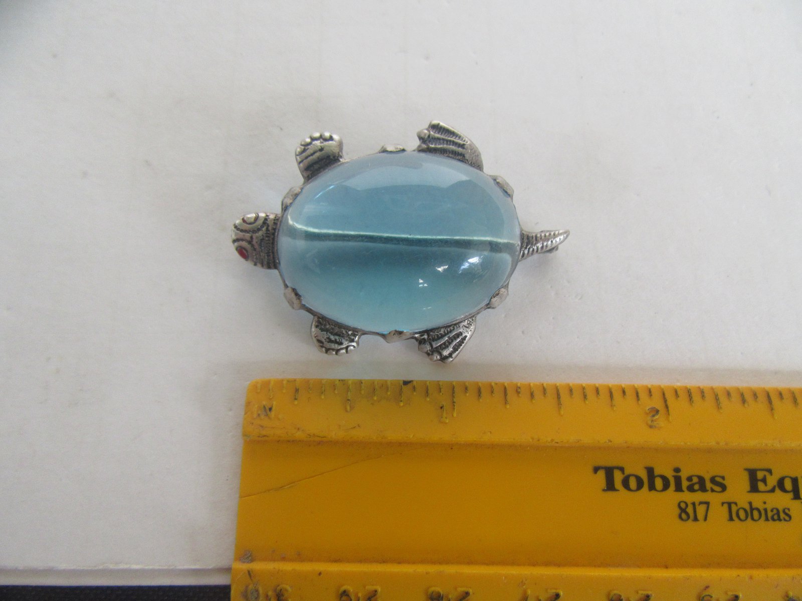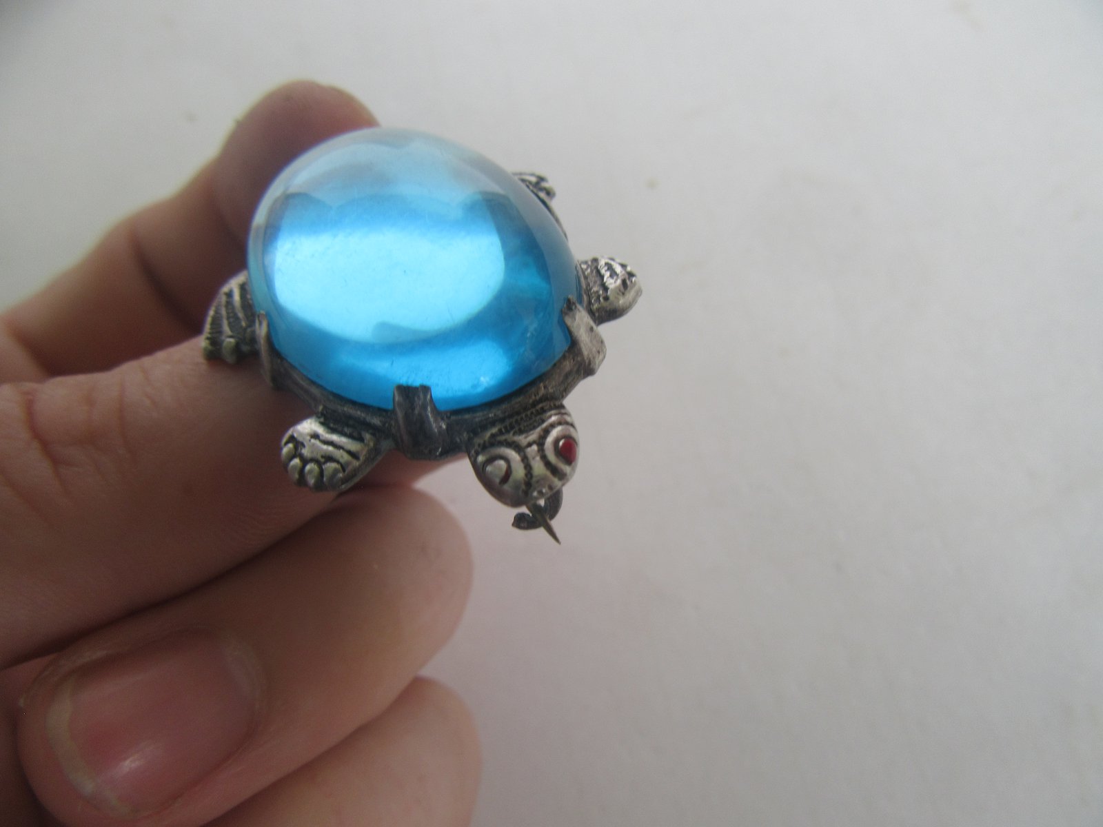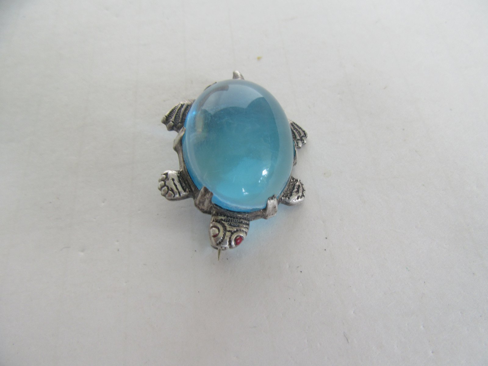 The turtle is unsigned. It came in a grouping of silver jewelry that I purchased, all of it was designer / Southwestern, and it has been tested as sterling. The eyes have red enamel paint, but most of it has rubbed away on the one eye. However, other than that is in very good condition.