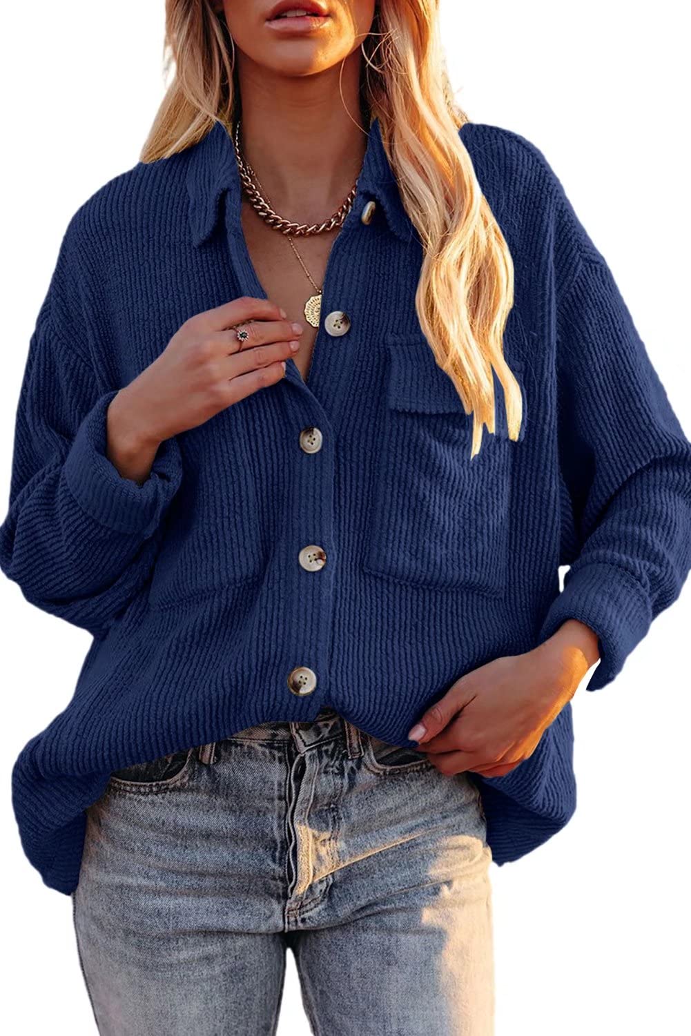 Womens Corduroy Shacket Button Down Shirts Casual Long Sleeve, Navy Blue S