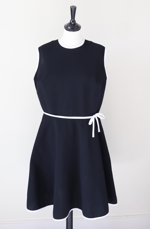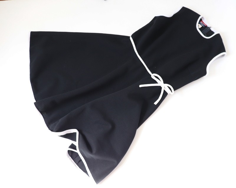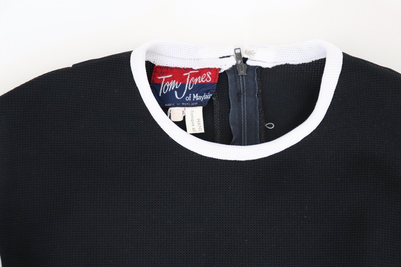 Original 1960s Tom Jones of Mayfair black waffle weave polyamide dress with white polyamide trim.