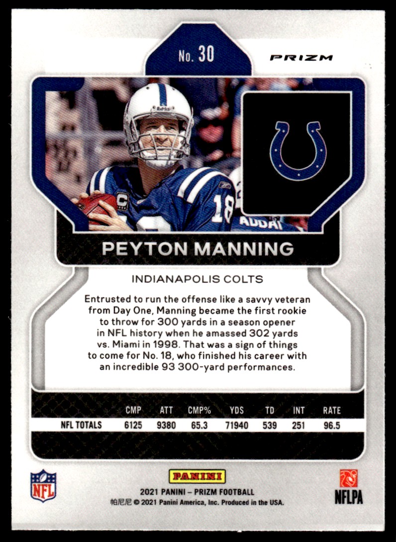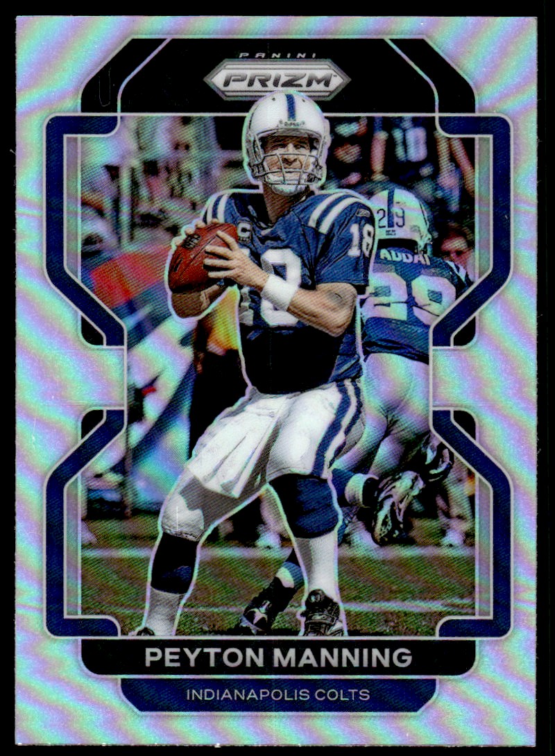 | Description: | Peyton Manning | | Category: | Football | | Year: | 2021 | | Product: | Panini Prizm | | Team: | Indianapolis Colts | | Card Number: | 30 | | Dimensions: | 3½" x 2½" |