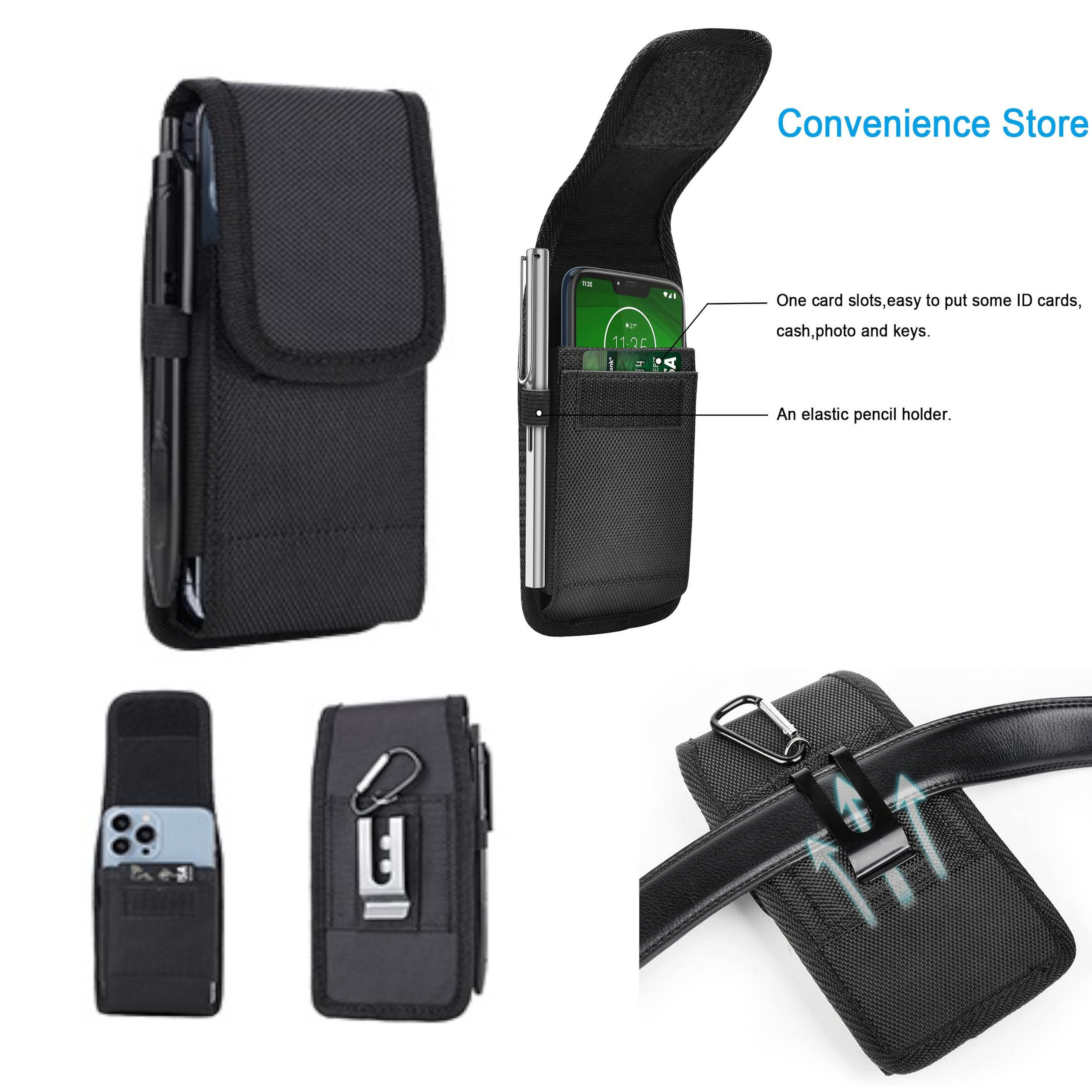 Functions: Holster case with belt loop, fixed metal belt clip and carabiner hook; 4 Different Ways to wear: Vertical/ Horizontal/ Clip On/ climbing hook. Elastic-type wide band to hold a pen or stylus on the case and 1 card holder design let everything be in harmony.