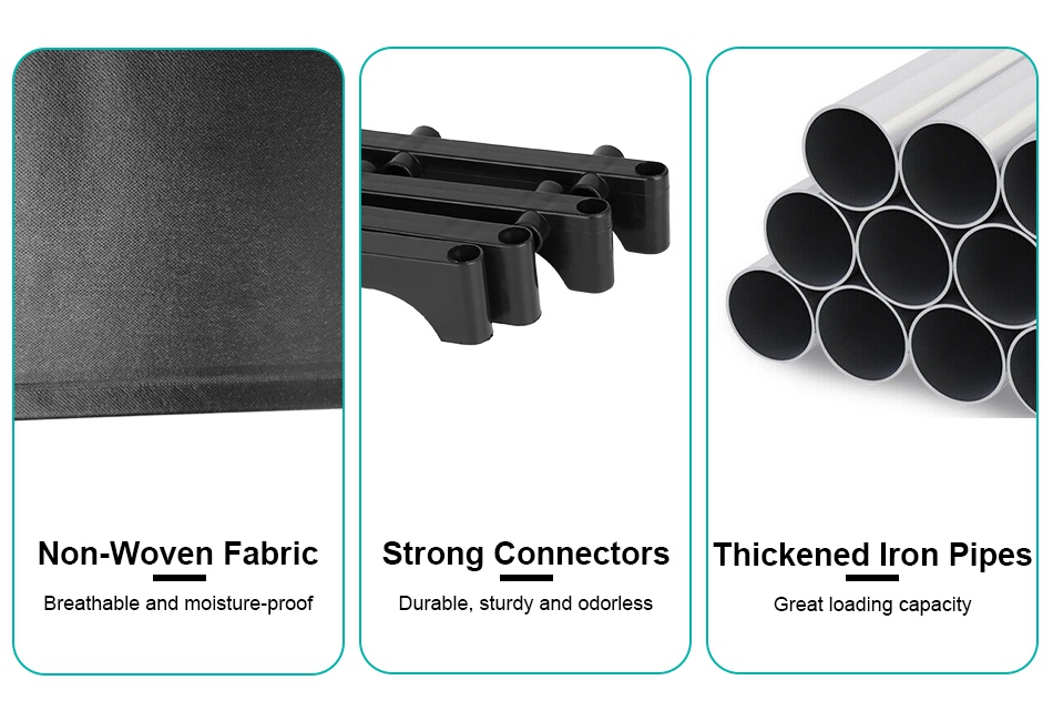 - Sturdy & Durable:Made of thickened iron pipes,has great load bearing capacity and withstand heavy stuffs. Coated non-woven fabric is breathable,durable,and moisture-proof. Opening design ensure ventilation and easy to fetch items.