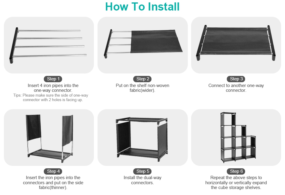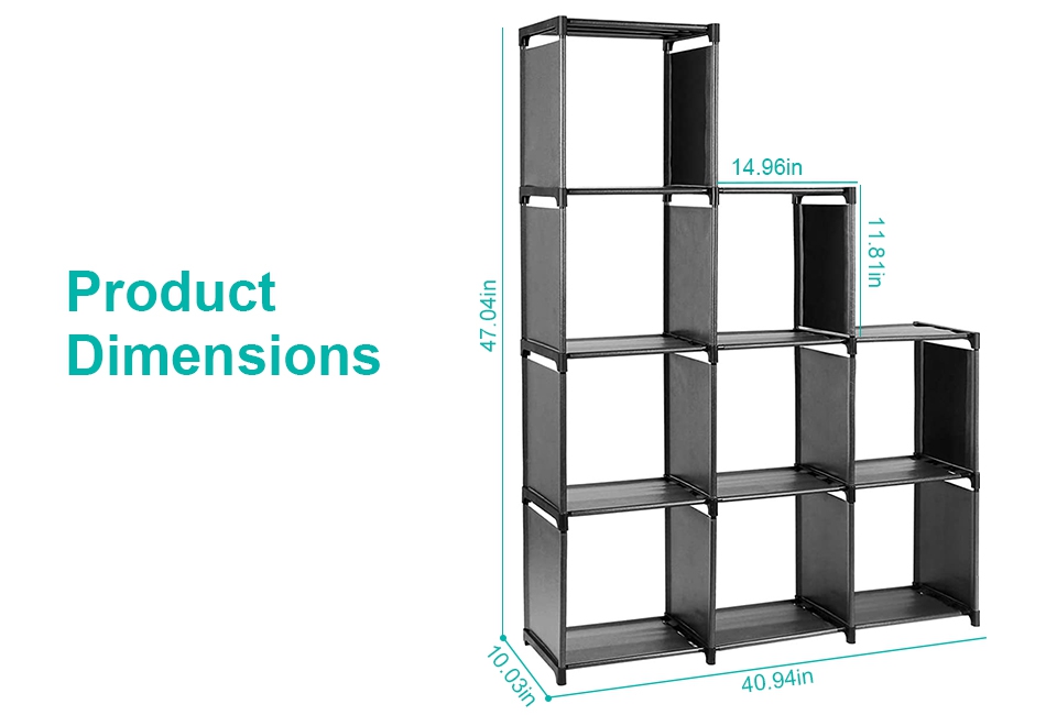 Are you tired of messy room which is full of objects? Our 9 cubes storage organizer is your perfect choice to help you keep room tidy and well organized. Each cube measuring 40.94x10.03x47.04in, 9 Cell in total has a large capacity to store various items. You can flexibly install these cubes according to you preference or to adapt the limited place. Made of thickened iron pipes and breathable non-woven fabric, our cube shelves are sturdy, durable, moisture-proof and have great loading capacity.